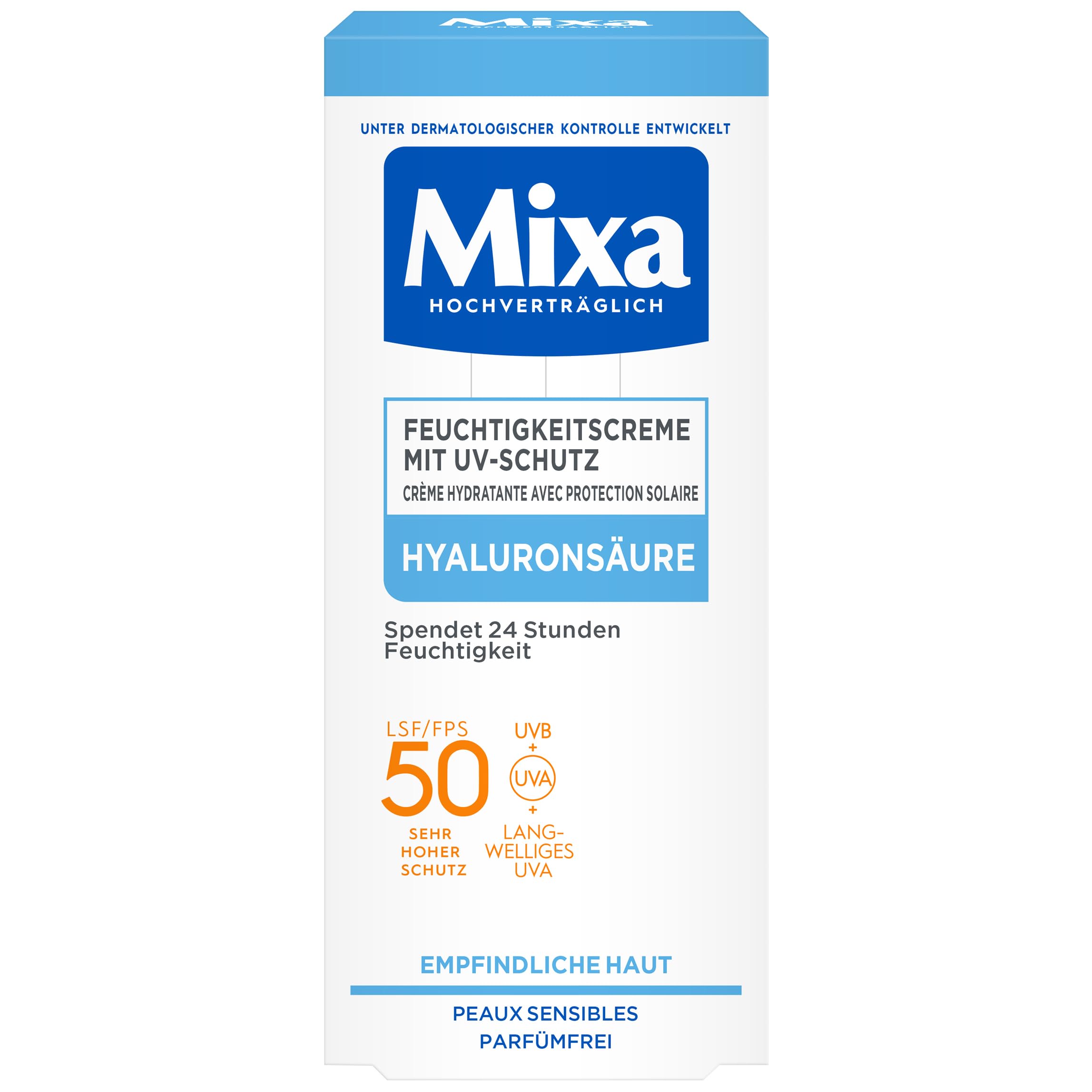 Mixa Moisturizing Cream with UV Protection is ideal as the finishing touch to a daily skincare routine for sensitive skin. Thanks to its SPF 50, it provides high protection against UVA and UVB rays, as well as long-wave UVA rays. This facial cream also helps combat the signs of premature skin aging. Furthermore, the skin is intensely moisturized for 24 hours, while the hyaluronic acid in the fragrance-free formula prevents moisture loss. The result is supple, cared-for skin that feels pleasant to the touch. INGREDIENTS Aqua Water • Isopropyl Myristate • Glycerin • Ethylhexyl Triazone • C12-15 Alkyl Benzoate • Zea Mays Starch Corn Starch • Niacinamide • Diisopropyl Sebacate • Bacate • Is-Ethyl Hexylophenol, methoxyphenyl triazine, dimethicone, butyl methoxydibenzoyl peroxide, potassium cetyl phate, stearyl alcohol, glyceryl stearate, PEG-1000 stearate, perlite, trisiloxane drometrizole, dicamphor sulfonic acid, triethanolamine, silica, phenylethyl resorcinol, ammonium polyacryloyldimethyl tauratate, polox 338, tocopherol, hydroxyacetophenone, caprylyl glycol, capryloyl salicylic acid, hydrolyzed hyaluronic acid, trisodium ethylenediamine disuccinate, xanthan gum Directions for use: Apply daily to the face and neck. For prolonged sun exposure, reapply generously and frequently. Avoid contact with eyes. SAFETY WARNING To verify the composition of a particular product, always consult the ingredient list on the product label. See morePackage contents: Mixa UV 50 Hydrating Care for sensitive skin, UVB UVA Long UVA protection, SPF 50, with hyaluronic acid, hypoallergenic, 50 ml. Light cream texture: breathable texture without leaving a white residue. Ingredients: blend of active ingredients, hydrating hyaluronic acid SPF 50 as protection against UV-related skin damage, hypoallergenic formula. Use: apply daily to the face and neck. In case of prolonged sun exposure, for better protection, reapply frequently and generously, avoiding contact with the eyes. Effect: 24-hour hydration, protection against external aggressors, daily use prevents premature aging and pigmentation caused by UV rays.Mixa Soin hydratant UV 50 pour peaux sensibles, protection contre les UVB UVA Long UVA, SPF 50, avec acide hyaluronique, convient pour le visage et le cou, hypoallergénique, 50 mlDESCRIPTION DU PRODUIT DESCRIPTION DU PRODUIT Mixa La crème hydratante avec protection UV convient comme conclusion de la routine quotidienne de soins de la peau des peaux sensibles. Grâce au facteur de protection solaire 50 inclus, il crée une protection élevée contre les rayons UVA et UVB ainsi que contre les UVA à ondes longues. En même temps, la crème pour le visage agit ainsi contre les signes du vieillissement prématuré de la peau. De plus, la peau est intensément hydratée pendant 24 heures, tandis que l'acide hyaluronique contenu dans la formule sans parfum empêche la perte d'hydratation. Le résultat est une peau souple et soignée, agréable au toucher. INGRÉDIENTS Aqua Water• Isopropyl Myristate • Glycérine • Ethylhexyle Triazone • C12-15 Alkyl Benzoate • ZEA MAYS STARCH CORN STARCH • NIACINAMIDE • DIISOPROPYL SEBACATE • BACATE • IS-ETHYL. Hexylophénol, méthoxyphényl, triazine, diméthicone, butyl-méthoxydibenzoyle, potassium cetyl phhate, alcool stéaryle, stéarate de glycéryle, PEG-1000. Stéarate PERLITE • TRISILOXANE DROMETRIZOLE • DICAMPHOR SULFONIC ACID • TRIETHANOLAMINE • SILICA • PHÉNYLETHYL RESORCINOL • AMMONIUM POLYACRYLOYLDIMETHYL TAURATATE. E • POLOX. AMER 338 • TOCOPHEROL • HYDROXYACÉTOPHENONE • CAPRYLYL GLYCOL • CAPRYLOYL SALICYLIC ACID • HYDROLYZED HYALURONIC ACID • TRISODIUM ETHYLENEDIAMINE DISUCCINATE • XANTHANTHANE GUM MODE D'EMPLOI Appliquer quotidiennement sur le visage et le cou. En cas d'exposition prolongée au soleil pour une meilleure protection, appliquer à plusieurs reprises et généreusement. Éviter le contact avec les yeux. AVERTISSEMENT DE SÉCURITÉ Pour vérifier la composition d'un produit particulier, consultez toujours la liste des ingrédients figurant sur le produit. Voir plusContenu de la livraison : Mixa UV 50 Hydrating Care pour peaux sensibles, protection UVB UVA Long UVA, SPF 50, avec acide hyaluronique, hypoallergénique, 50 ml. Texture crème légère : texture respirante sans laisser de résidus blancs. Ingrédients : mélange d'actifs, acide hyaluronique hydratant SPF 50 comme protection contre les dommages cutanés liés aux UV, formule hypoallergénique. Utilisation : appliquer quotidiennement sur le visage et le cou. En cas d'exposition prolongée au soleil pour une meilleure protection, appliquer à plusieurs reprises et généreusement éviter le contact avec les yeux. Effet : humidité 24H, protection contre les agresseurs externes, utilisation quotidienne empêche le vieillissement prématuré et la pigmentation due aux rayons UV.