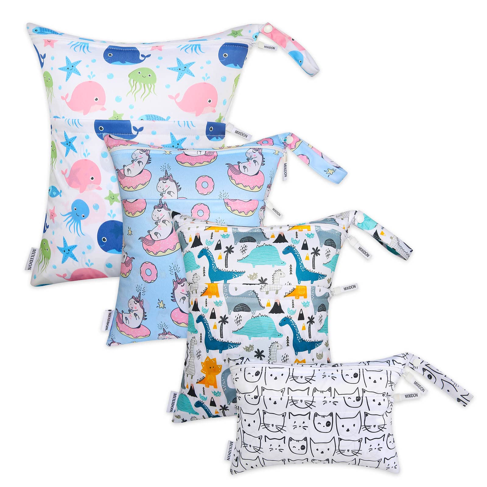 MIXIDON Wet Bag Multi-functional Organizer Bag Water, Stain and Odor Resistant Buyer's voice: Stefanie: "As a mother who's had two babies wet dry bags are a must. I've used them for wet swimsuits, soiled clothes, dirty bottles, trash. Even works great to keep snacks cold and anything with liquid you dont want to accidentally spill. " Noelle: "These are absolutely brilliant. So good I ended up buying a second. I throw it in the baby changing bag and use it for dirty washing and at 8 months old there are a lot of soggy wet bibs to contain. We have never had mess or wetness soak through onto anything else in his bag and have been using them for 8 months now. For us, they are a must have baby item." Features: Waterproof Our unique soft-yet-waterproof fabric is a polyester that is fused to a buttery soft waterproof layer and is designed to catch spills and splashes. Made to Last Our wet bags are lightweight, durable, quick-drying and stain resistant, making them durable and versatile for all your storage needs. Easy to Clean Our wet bags wipe clean for a quick clean and can also be machine washed for deep clean. Do not iron as it may damage the waterproof layer. Portable Snap wristlet attaches onto a stroller handle or suitcase for baby necessities on-the-go. Package: 1 PCS: 1 Small Wet Bag (11.8" x 8.2" ) 2 PCS: 2 Medium Wet Bag (11.8" x 14.1") or 1 Medium Wet Bag (11.8" x 14.1") 1 Medium Wet Bag (11" x 11.8") 3 PCS: 1 Small Wet Bag (11.8" x 8.2" ) 1 Medium Wet Bag (11.8" x 14.1" ) 1 Large Wet Bag (13.3" x 17.3" ) 4 PCS: 1 Small Wet Bag (11.8" x 8.2" ) 2 Medium Wet Bag (11.8" x 14.1" ) 1 Large Wet Bag (13.3" x 17.3" ) Wash Tips: Machine wash below 35Do not iron Do not bleach