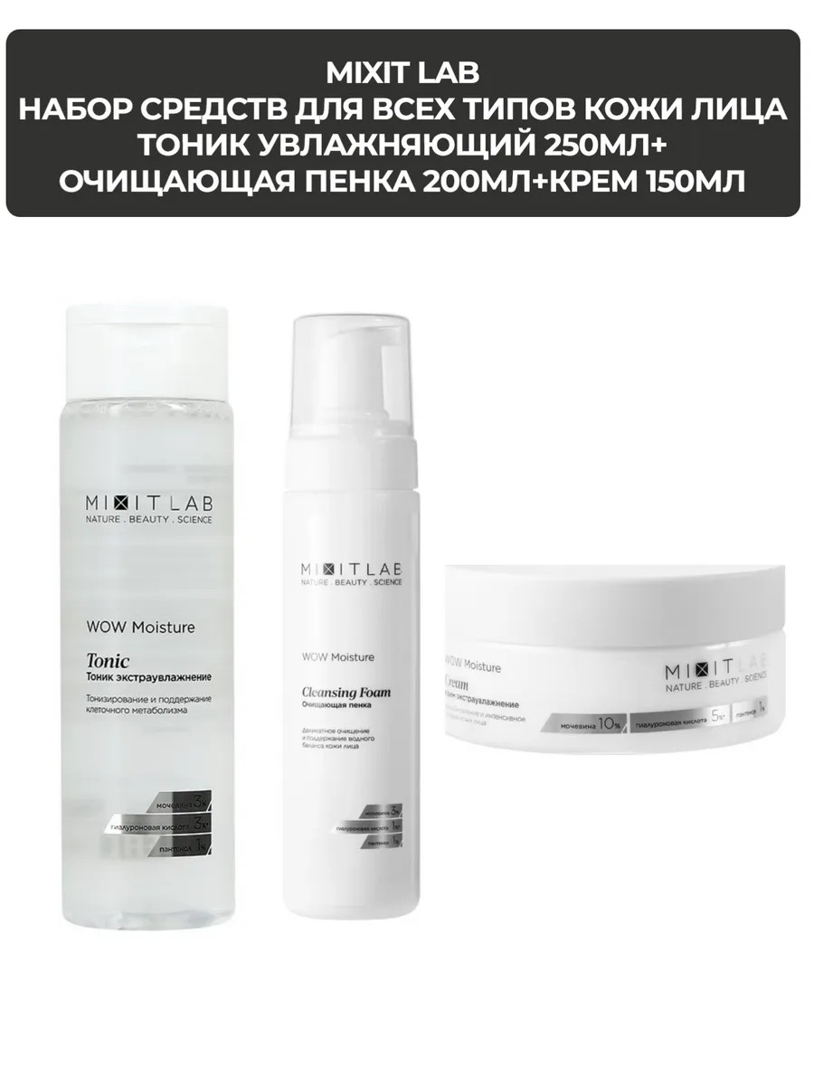 | Комплектация | MIXIT LAB Тоник экстра увлажнение для всех типов кожи 250 мл; MIXIT Lab WOW Очищающая пенка для всех типов кожи 200 мл; MIXIT Lab WOW Крем экстра увлажнение для всех типов кожи 150 мл |