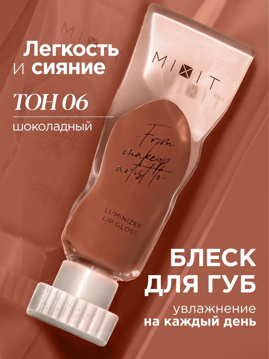 Make up Luminizer Lip Gloss, тон 06 — мерцающий стойкий блеск для губ Mixit пудрового коричневого оттенка, который придаёт губам увеличивающий стеклянный финиш и обеспечивает невероятный уход и увлажнение. Органическая натуральная формула на основе ухаживающих масел оказывает интенсивный увлажняющий и питающий кожу губ ежедневный уход, а красивый нюдовый оттенок с шиммером подчёркивает естественную красоту, добавляя образу выразительность.