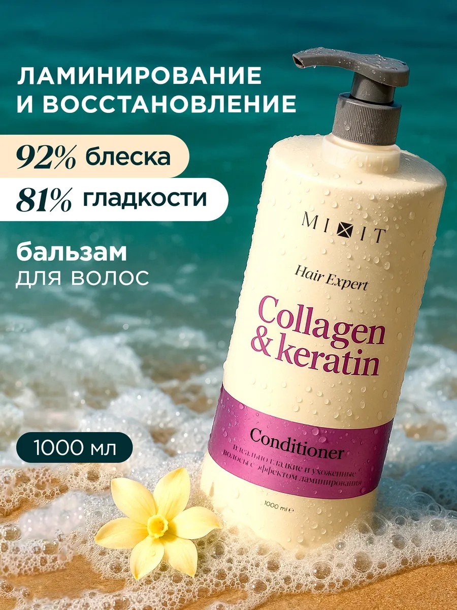 МИКСИТ Conditioner Collagen & Keratin Hair Expert Женский парфюмированный кондиционер для волос с эффектом «жидкий шелк» - проф косметический уход для волос, который создан специально для придания блеска, гладкости и ламинирования в домашних условиях для кудрявых и вьющихся волос, а также для тонких мелированных с блондом и осветленных, пористых и ослабленных после окрашивания локонов женщин и мужчин. Уходовый восстанавливающий и разглаживающий бальзам для легкого расчесывания, как реконструктор, направлен на уплотнение и питание, увлажнение структуры волос по всей длине, на защиту от ломкости, секущихся кончиков и пушистости. Натуральный мягкий комплекс с коллагеном и кератином, как sos восстановитель, глубоко проникает в структуру и помогает восстановить блонд и волнистые локоны, борется с тусклостью, придает здоровый блеск, мягкость и восстановление.