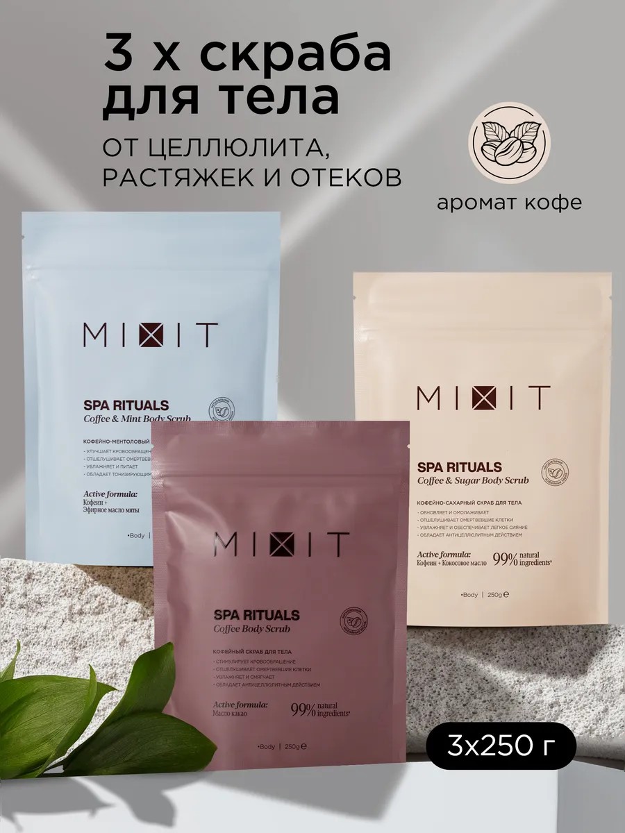 MIXIT Spa Rituals Body Scrub Gift Set for Body, Hands, and Feet! This cosmetic box includes three detoxifying body scrubs: coffee, sugar, and mint with menthol. They are designed to intensively combat skin imperfections.