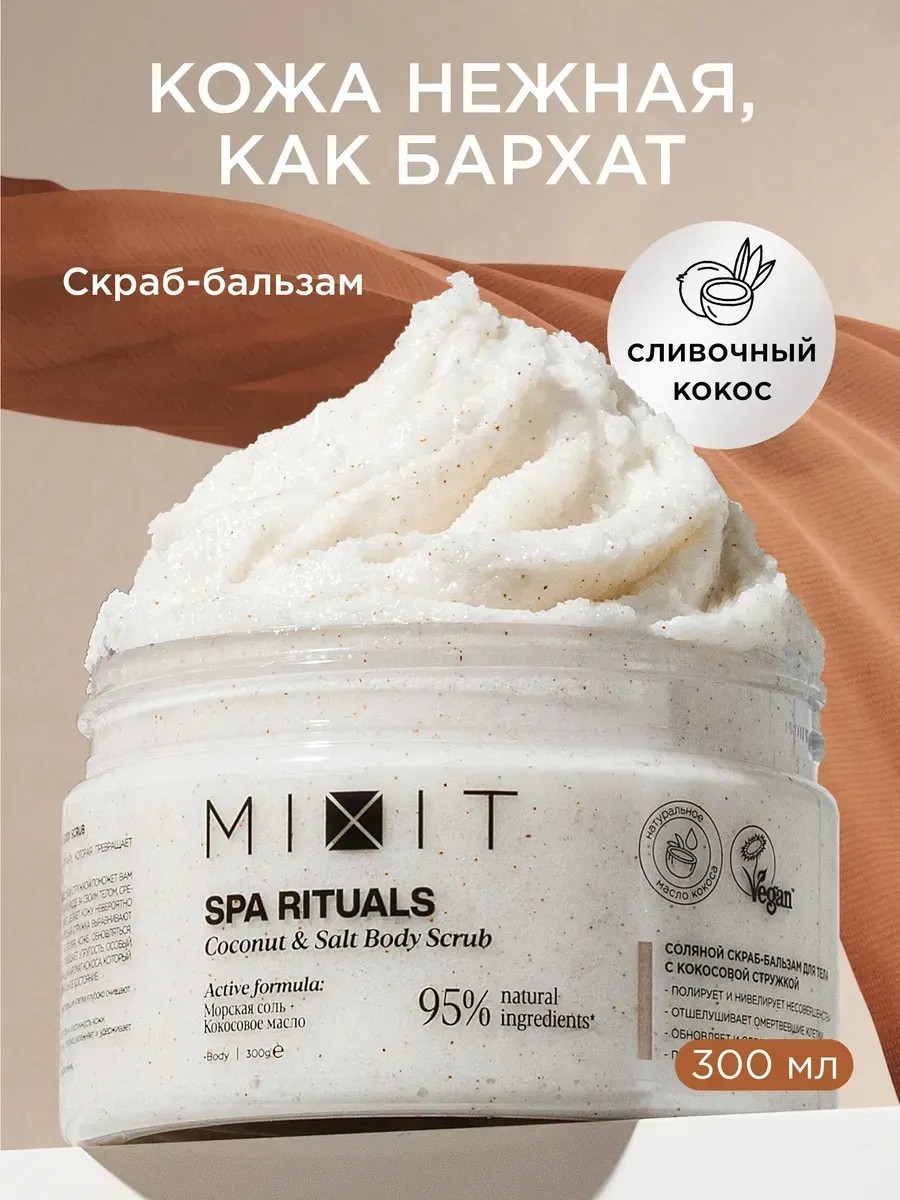 МИКСИТ SPA RITUALS Coconut Body Scrub – это настоящий союз нежности и эффективности для совершенства кожи тела, рук и ног! Отличный подарок на 8 марта подруге, любимой, маме, коллегам, женщинам, девочке или учителю. Соляной антицеллюлитный скраб бальзам очищает кожу, способствуя её обновлению, бережно отшелушивает ороговевшие клетки и выравнивает рельеф. Масляная текстура интенсивно увлажняет, питает и смягчает, делает кожу упругой и эластичной. А нежный аромат кокоса дарит релакс и остается на теле легкой вуалью на весь день! Кокосовое, миндальное и масло ши содержат полезные витамины в составе, которые обеспечивают омоложение и восстановление упругости, глубокое увлажнение. Морская соль направлена на глубокое очищение пор, а также устранение отечности и целлюлита. Наш подтягивающий лифтинг скраб с маслами станет хорошим помощником для похудения в домашних условиях и избавления от отеков. Наносите мягкий соленой увлажняющий и смягчающий скраб для массажа и борьбы с целлюлитом на влажное тело, а также на зоны стоп и пяток. Результат не заставит вас долго ждать - ваша кожа станет мягкой, гладкой и идеальной без сухости уже после первого применения. А через 21 день Вы получите красивый рельеф и тон, четкость контуров и уменьшение растяжек, упругость и эластичность. Гоммаж для пяточек и ступней подходит для проблемной и жирной, сухой кожи. Женская и мужская органическая профессиональная уходовая косметика уход за телом. Подарочный парфюмированный солевой скраб в банке удобно брать для бани, душевой и с собой. Попробуйте другие наши боди новинки и эффективные органик средства для ванны mixit RSSB. прекрасная альтернатива корейским брендам и профессиональной косметики из Кореи. Не подходит для лица.