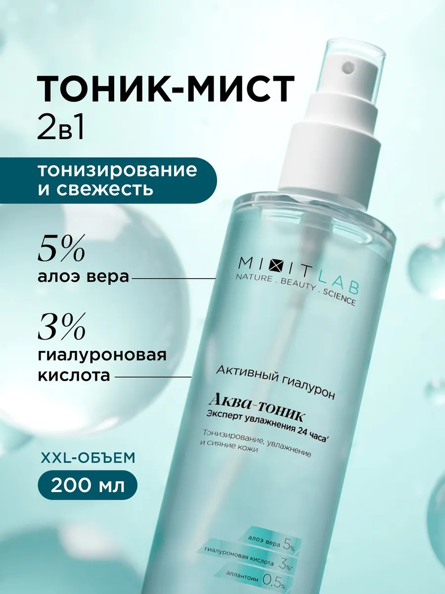 MIXIT Hyaluronic Facial Toner with Aloe, Hyaluronic, and Lactic Acids LAB Aqua Hyaluron Tonic is the ideal beauty product for very dry skin. This refreshing hyaluronic toner gently cleanses the skin without drying or flaking, restoring the skin's pH after cleansing. It contains many moisturizing ingredients that provide deep nourishment and promote facial elasticity. Hyaluronic acid soothes and hydrates. The acid complex gently cleanses, boosts immunity, and provides an exfoliating effect.