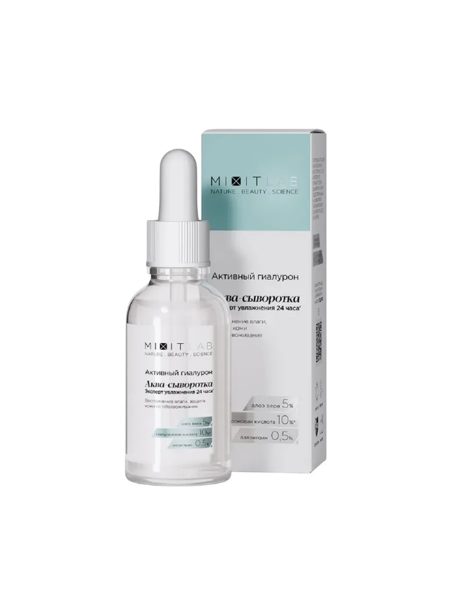 Формула аква-сыворотки на основе увлажняющего комплекса с 10% гиалуроновой кислотой, алоэ вера и аллантоином восстанавливает гидробаланс, удерживая влагу в глубоких слоях эпидермиса. Способствует поддержанию эластичности и упругости кожи.