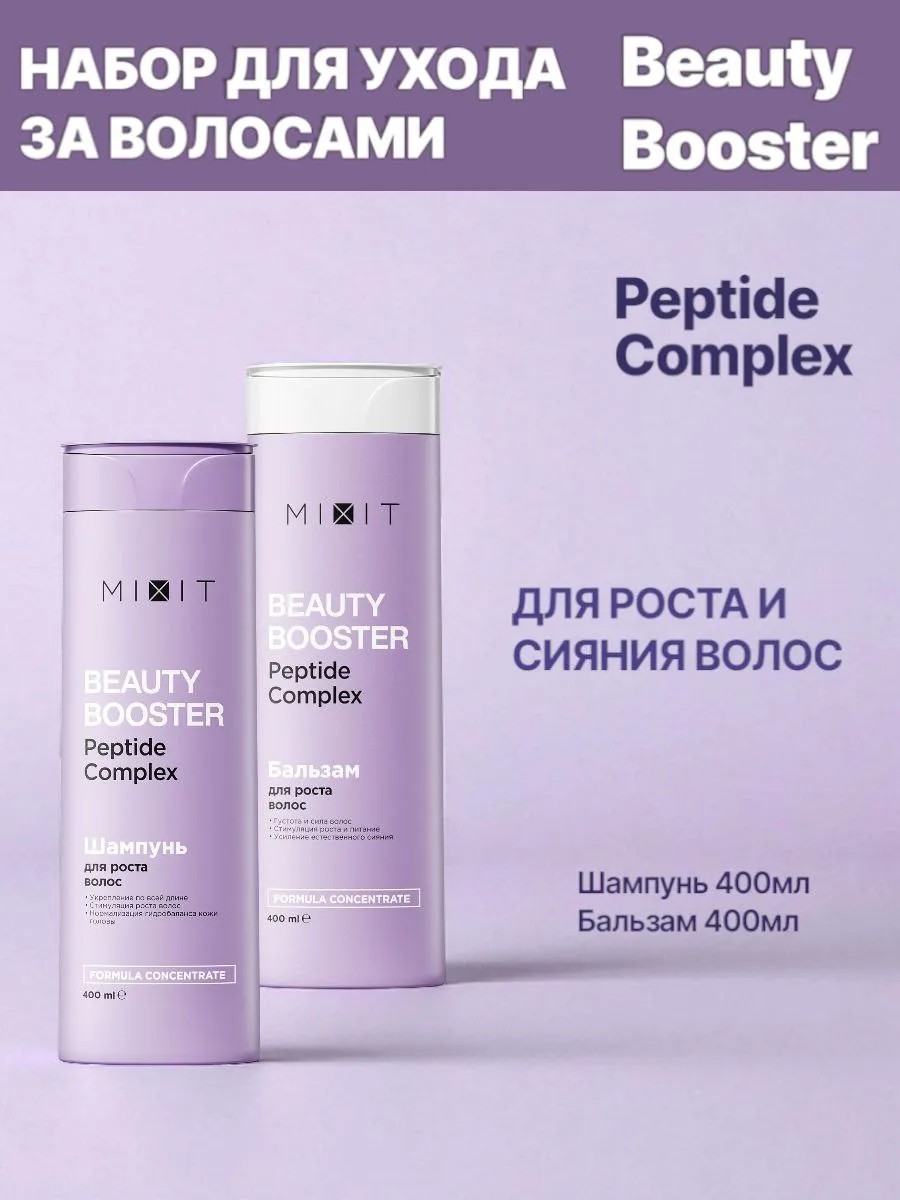 Шампунь стимулирует рост волос, питает по длине и предотвращает секущиеся кончики. Основные преимущества: бережное очищение, отшелушивание кожи головы, защита от ломкости, увлажнение. Активные компоненты: пептидный комплекс, масло бразильского авокадо, энзимы ананаса и папайи. Бальзам-ополаскиватель из коллекции beauty booster усиливает рост волос, питает, восстанавливает структуру и предотвращает секущиеся кончики. Содержит пептидный комплекс, масло бразильского авокадо и энзимы ананаса/папайи. Обеспечивает мягкое отшелушивание, глубокое питание, восстановление структуры, защиту от ломкости и красивый блеск волос.Оба средства предназначены для быстрого роста и здорового блеска волос.