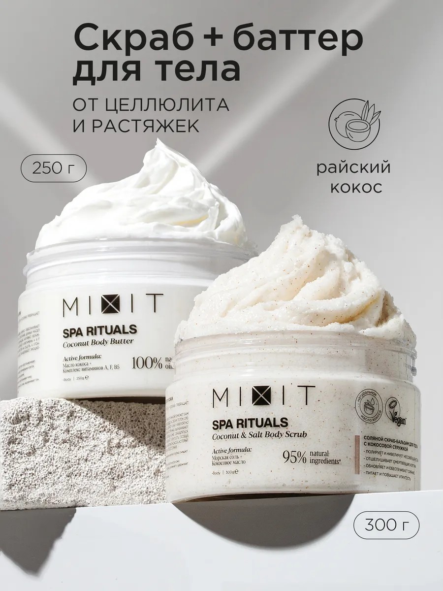 MIXIT SPA RITUALS Coconut-Scented Body Gift Set. Inside the box: Coconut Body Butter moisturizing cream and Coconut & Salt Body Scrub exfoliating scrub. These care products are designed to cleanse and exfoliate, instantly hydrate, reduce puffiness, and combat stretch marks and cellulite. The exfoliating scrub with sea salt cleanses the body and exfoliates dead skin cells. It provides an anti-cellulite and firming effect, reduces swelling, and has a rejuvenating effect. Butter with shea and coconut oils effectively moisturizes, leaving skin soft and silky. It eliminates dryness and irritation. The perfumed detoxifying product also imparts a delicate coconut scent to the skin. The natural composition of these cosmetics will help preserve the beauty and health of your skin. Walnut shells in the hard nut scrub provide an anti-cellulite effect. Almond oil has a lipid-restoring effect. Shea butter accelerates regeneration processes and gives the skin a healthy appearance. Spa products are suitable for all skin types: normal and dry, oily and problematic, for men and women. Directions: Remove impurities with our cleansing gel. Apply a salt scrub gommage to damp or dry skin of your hands, legs, and feet. Rinse with water after a gentle massage. Finish with a softening eco cream. Can be used as an organic day and night care. Result: anti-aging lifting effect, accelerated weight loss and fat-burning processes, stretch mark prevention, and reduced swelling. Large volume: organic oil cream – 250 g, salt scrub – 300 g. A great gift for a friend, mother, wife, or a teenager for February 14th, February 23rd, or March 8th. Bath sets for teenagers. Cosmetic products for the bath, bathhouse, and sauna. MIXIT is an organic cosmetics brand for professional personal care. A wonderful alternative to Korean brands and professional cosmetics from Korea.