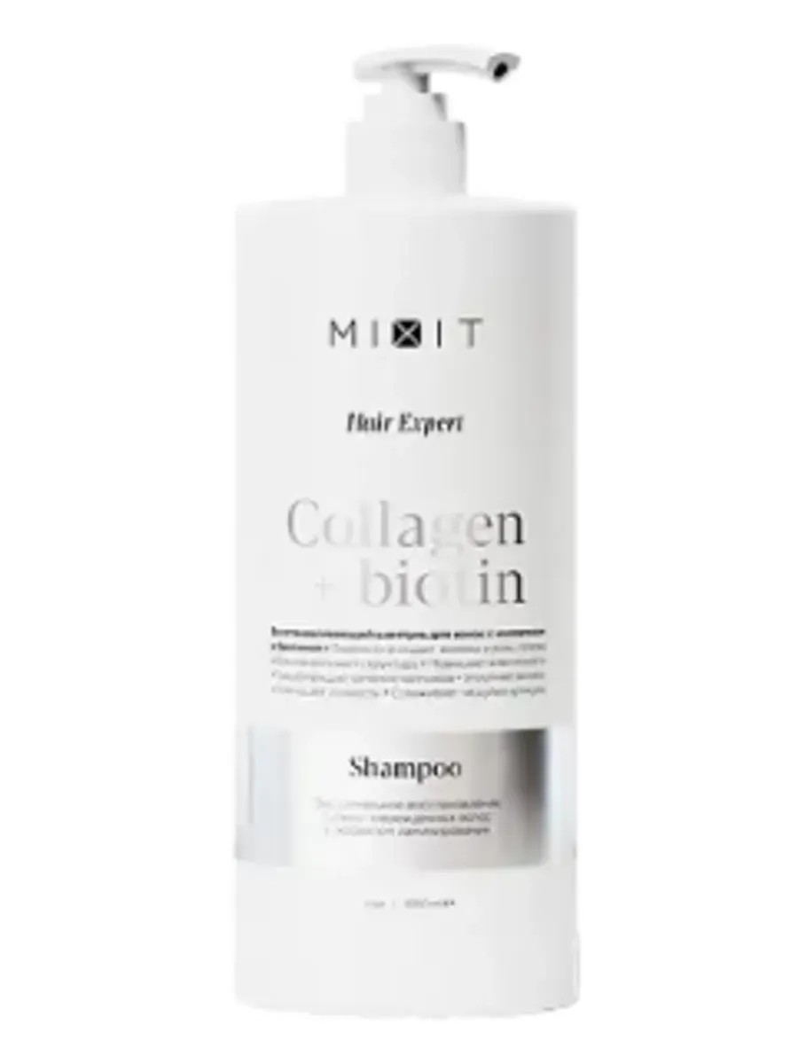 Mixit, Восстанавливающий шампунь для волос Collagen+Biotin 1000 мл., 1 шт. Восстанавливающий шампунь для волос с коллагеном и биотином бережно очищает кожу головы, регулирует выработку себума, продлевая свежесть. Разработанная экспертами биодоступная формула направлена на экстремальное восстановление сильно поврежденных волос по всей длине. Комплексное действие коллагена и биотина уплотняет волосы, сглаживает чешуйки кутикулы и предотвращает сечение кончиков. Результат - крепкие волосы, восстановленные от корней до кончиков.