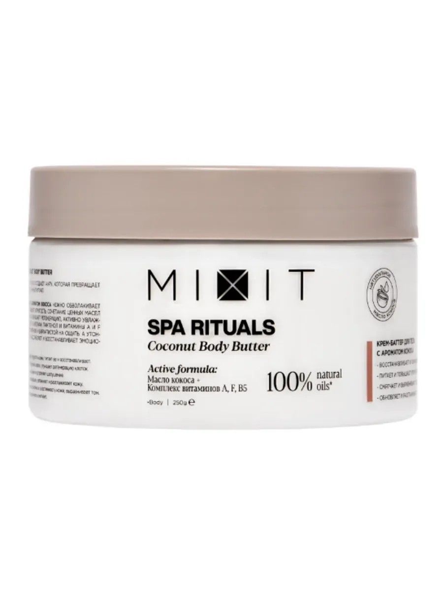 Mixit, Крем-баттер для тела с ароматом кокоса Spa Rituals Coconut Body Butter 250 г., 1 шт. Крем-баттер для тела с ароматом кокоса нежно обволакивает кожу, питает ее и повышает упругость. Сочетание ценных масел макадамии, ши и кокоса улучшает регенерацию, активно увлажняет и удерживает влагу в клетках. Пантенол и витамины A и F делают кожу мягкой, приятной и бархатистой на ощупь. А утонченный аромат кокоса расслабляет и восстанавливает эмоциональное состояние.