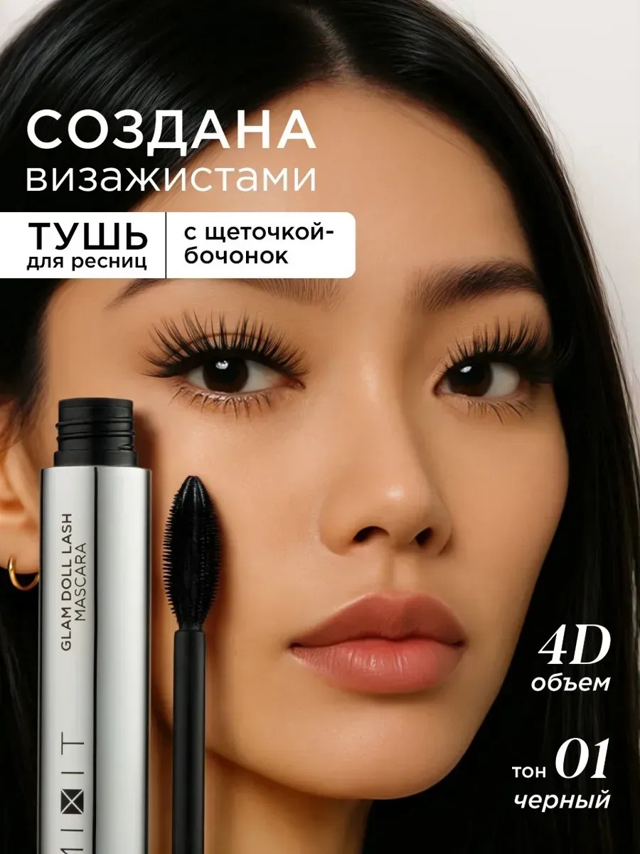 МИКСИТ Стойкая чёрная тушь с эффектом кукольных ресниц Make Up Glam Doll Lash Mascara подкручивает каждый волосок нижних и верхних ресничек, даже в уголках глаз.