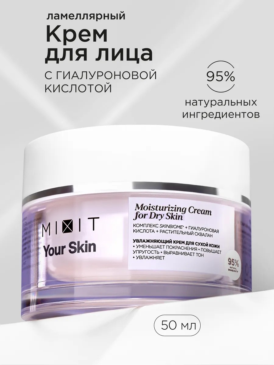 MIXIT Увлажняющий гиалуроновый ламеллярный крем для лица Your Skin создан специально для эффективного ухода за кожей 30+. Формула с гиалуроновой кислотой помогает бороться с сухостью, устраняет шелушения и делает кожу более гладкой. Средство подходит для женщин и мужчин с любым типом кожи: сухой, комбинированной, жирной, чувствительной и даже проблемной. Благодаря легкой текстуре, флюид быстро впитывается и не оставляет липкости. Крем для лица для чувствительной и сухой кожи лица подходит как женский и мужской дневной или ночной уход.