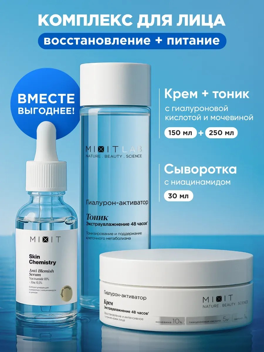 МИКСИТ Уходовый набор гиалуроновый - профессиональный комплексный уход за кожей лица WOW Moisture. В косметический комплект входят очищающий тоник с гиалуроновой кислотой, питательный и легкий омолаживающий гиалурон крем с мочевиной, маслом ши и пантенолом и себорегулирующая сыворотка для сужения пор и выравнивания тона с ниацинамидом и цинком. Антивозрастной и восстанавливающий парфюмированный тонер глубоко увлажняет, успокаивает и бережно очищает кожу от загрязнений и остатков макияжа без сухости и шелушения. Пантенол, входящий в состав, важный компонент, который способствует повышению упругости, оказывая успокаивающий и регенерирующий эффект. Осветляющая сыворотка с витамином B5 сужает поры, борется против черных точек на носу, расширенных пор и пигментных пятен. Антивозрастной крем направлен на интенсивное питание, выравнивание морщин и супер увлажнение кожи. Антивозрастной дневной и ночной крем для сияния лица направлен на активное питание кожи, сокращение глубоких морщин. Подходят для всех типов кожи,