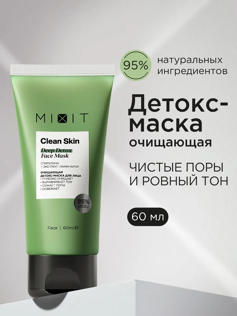 MIXIT Green Clay Face Mask with Spirulina and Kaolin in a Tube Clean Skin Deep Detox Face SOS Mask with Spirulina is a professional comprehensive treatment for problem skin that deeply cleanses and normalizes sebum secretion, helping fight blackheads on the nose and inflammation. This kaolin mask tightens and deeply cleanses enlarged pores, evens out skin tone, and lightens post-acne marks.