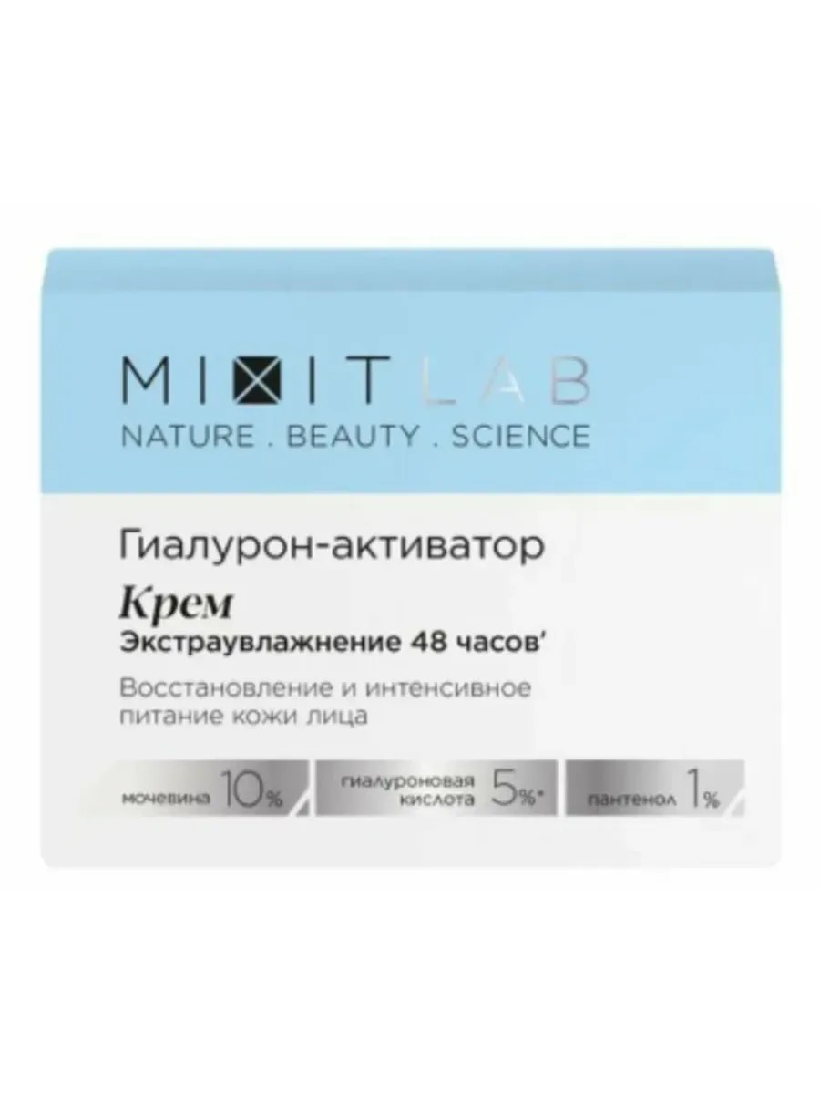 Mixit, Hyaluron Activator Face Cream, Extra Moisturizing with Urea and Hyaluronic Acid for All Skin Types, 50 ml, 1 pc. This extra-moisturizing face cream with hyaluronic acid, 10% urea, and panthenol is designed for daily care of dehydrated skin. The active formula maintains hydrolipid balance, eliminates tightness, and helps smooth fine lines.