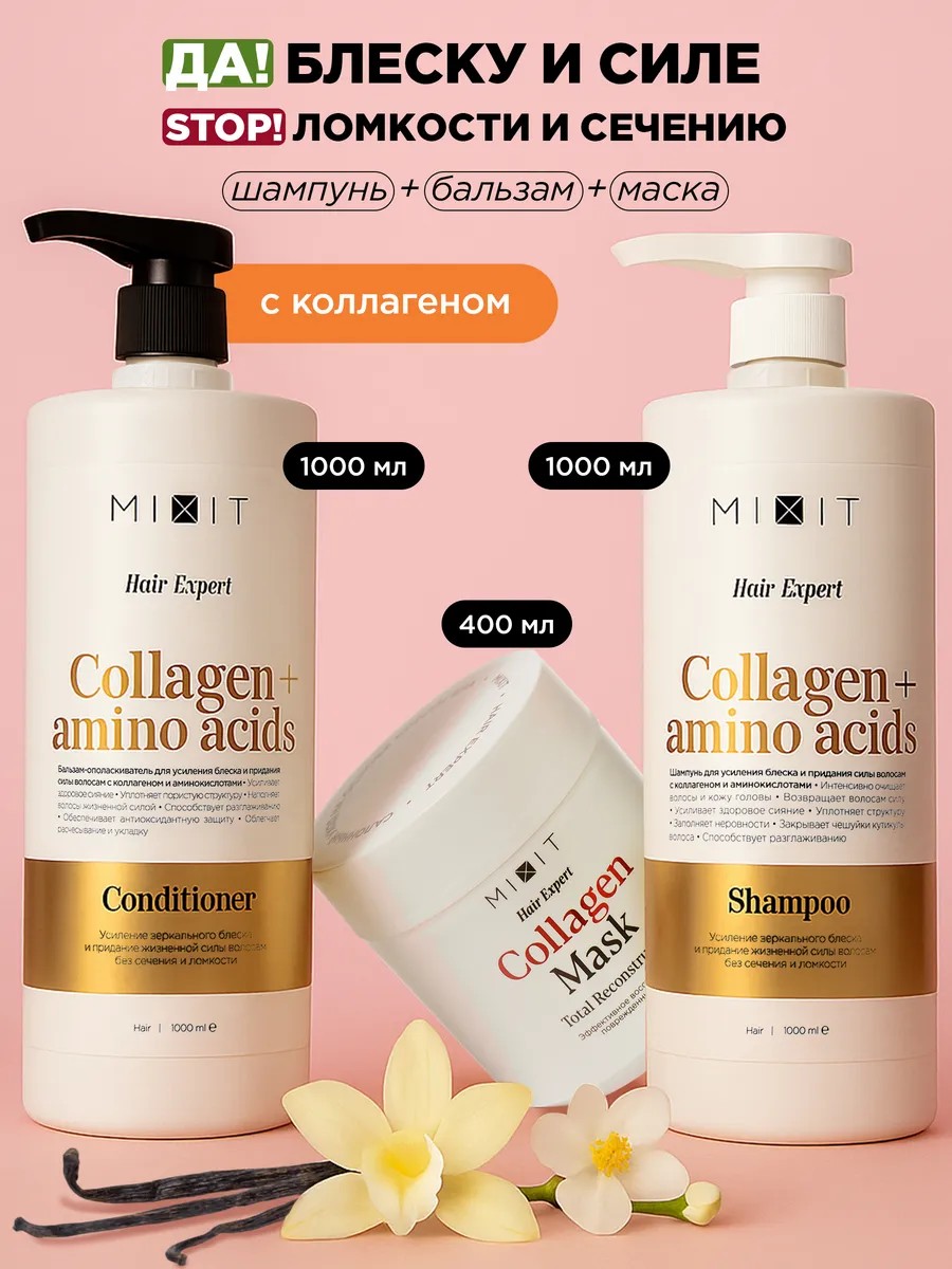 МИКСИТ Hair Expert Collagen & Amino and Total Reconstruct Mask Подарочный женский комплекс уходовой косметики - профессиональный уход для окрашенных, пушистых и мелированных, тонких и крашенных светлых волос. В косметический уходовый набор для восстановления волос входят три средства, уплотняющий кондиционер ополаскиватель для легкого расчесывания, парфюмированный очищающий шампунь глубокой очистки кожи головы, увлажняющая и восстанавливающая коллагеновая маска. Все товары глубоко увлажняют и восстанавливают структуру локонов и кончиков волос. Питательная и разглаживающая маска с эффектом ботокса обеспечивает холодное восстановление и ламинирование, увлажнение и уплотнение, помогает против пушистости блонда, ломкости и пористых волос как счастье для волос. Маска для волос с маслами помогает восстановить волнистые пряди. Маска для волос с кератином и коллагеном идеальное спасение для женщин с блондом, для вьющихся кудрей, обесцвеченных и ослабленных локонов после окрашивания, снятия нарощенных кератиновых капсул или химической завивки и для поврежденных волос. Сначала используй мягкий укрепляющий шампунь для блеска, густоты и плотности локонов, который подходит для чувствительной кожи головы. После очищения – питающая и выпрямляющая экспресс маска. После масочки нанеси кондиционер. Результат – гладкие и блестящие волосы без ломких концов, накопительный эффект и красота, защита от сухости. Большой объем идеален для ежедневного применения в ванной и для бани. Средства подходят для седых и нормальных, темных брюнеток и рыжих, жирных, склонных к жирности и длинных, комбинированных и белых, для окрашенных волос и густых. Мужской натуральный банный сос набор работает как подростковая корейская косметика (Корея) для подростков девочек и мужчин. Подарок подруге или любимой девушке на др, бабушке, сестре и коллеге.