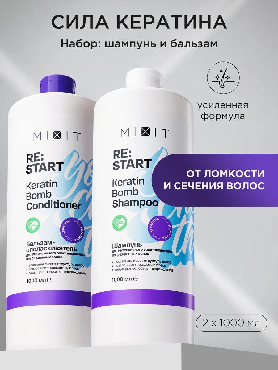 МИКСИТ Выгодный набор для волос 2в1 RE:START Keratin bomb hair shampoo and conditioner – это салонный уход у Вас дома! В него входят шампунь женский профессиональный очищающий бережной глубокой очистки и парфюмированный бальзам ополаскиватель для волос по 1000 мл (1 литр). Наши проф средства рестарт направлены на сос восстановление структуры блонда, осветленных и пористых, обесцвеченных и пушистых, ломких и ослабленных, окрашенных и жирных, кудрявых и вьющихся волос. Комплексный профессионал уход увлажняет и укрепляет их по всей длине, обеспечивает здоровый блеск, гладкость мягкость и питание.
