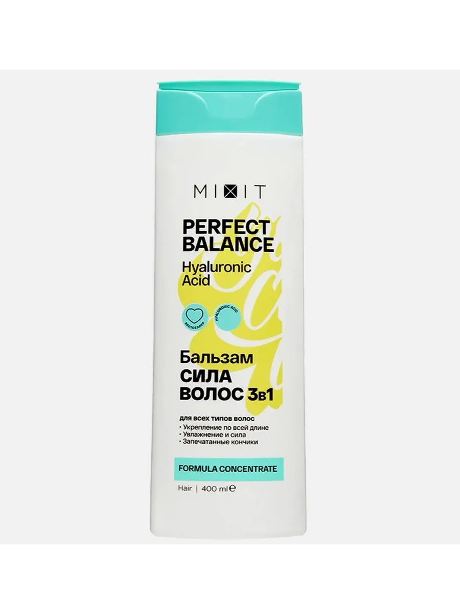 Бальзам-кондиционер Mixit Perfect balance для волос содержит гиалуроновую кислоту и антиоксидантный комплекс — увлажняет и смягчает, предотвращает появление секущихся кончиков. Витамины А, С, Е и экстракт ламинарии — питают и укрепляют корни, облегчают расчесывание локонов. Подходит для всех типов волос.
