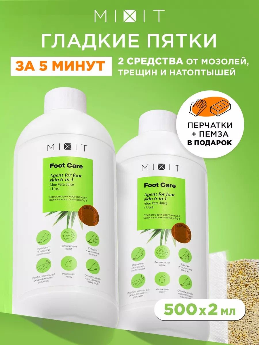 МИКСИТ Выгодные педикюрные наборы! Кератолитик для удаления огрубевшей кожи Foot Care Agent for foot skin 6-in-1 – эффективное профессиональное средство для педикюра и ухода за сухой кожей ног и пяток в домашних условиях. Перчатки и пемза в подарок. Кератолитик для гладких стоп и пяток с мочевиной направлены на устранение сухих мозолей и натоптышей, заживление трещин, отшелушивание и увлажнение и размягчения.