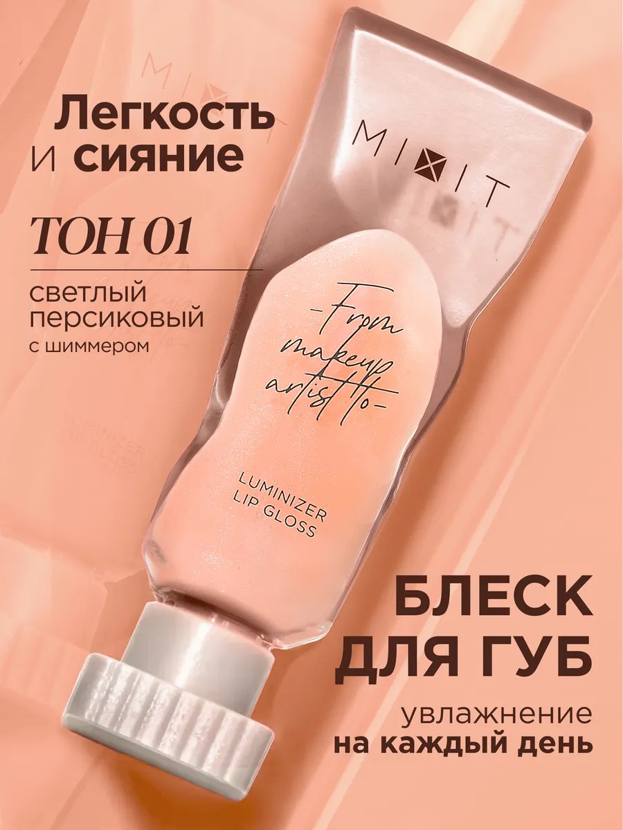 MIXIT Luminizer Lip Gloss тон 01 — мерцающий стойкий блеск для губ Mixit пудрового розового оттенка, который придаёт губам увеличивающий стеклянный финиш и обеспечивает невероятный уход и увлажнение.