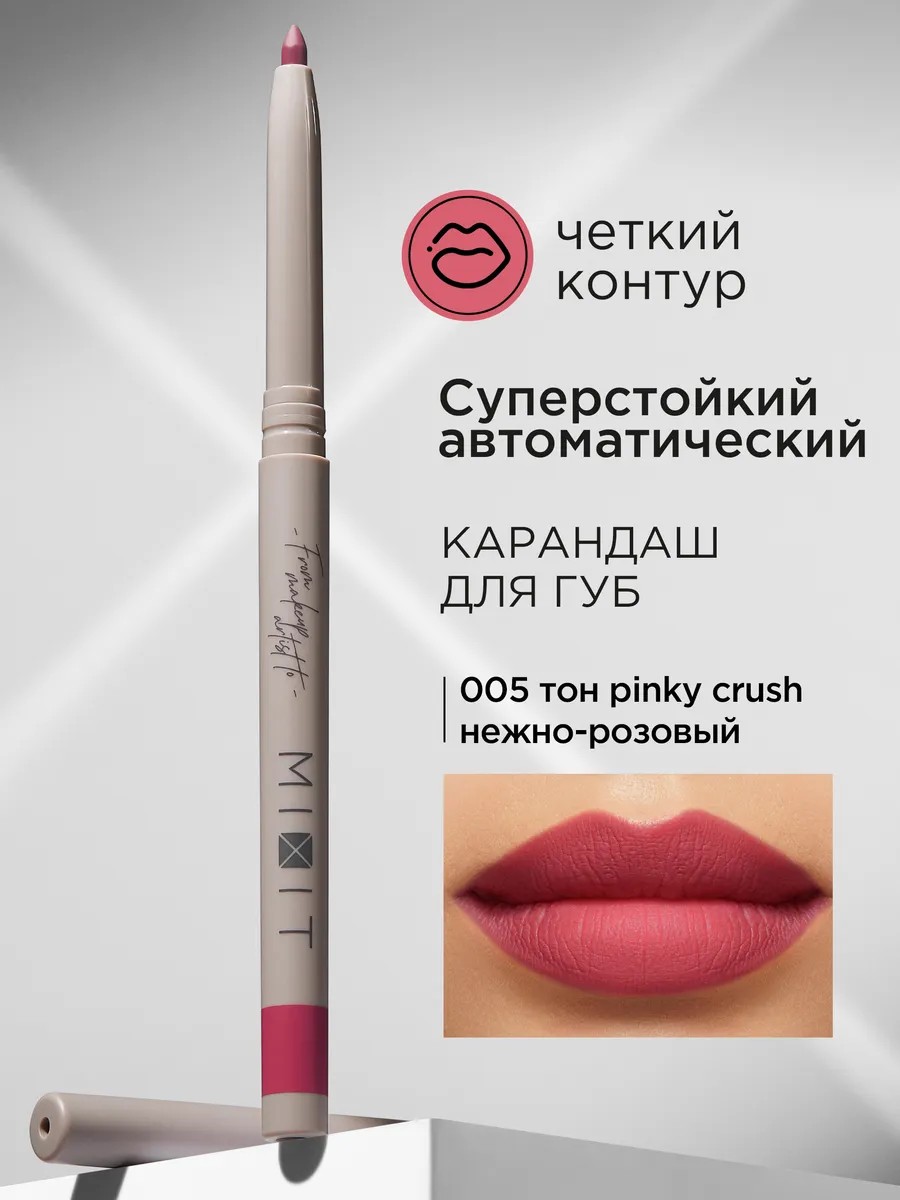 МИКСИТ Стойкий мягкий карандаш для губ Make Up Longwearing lip pencil color тон 005 создает идеальный тонкий контур и подчеркивает форму губ. Механический выкручивающийся лайнер помогает визуально увеличить объем, легко растушевывается и дополняет любой макияж. Кремовая текстура комфортно ощущается на губах, не скатывает в течение дня и не сушит. Гелевый выдвижной и косметический матовый губной карандаш увеличитель подходит для контуринга, как подводка, и для нанесения на всю поверхность губ, чтобы они надолго оставались бархатисто-матовыми и красивыми. Воск обеспечивает нежный уход за кожей губ. Светлый оттенок дарит невероятный эффект увеличения объема.