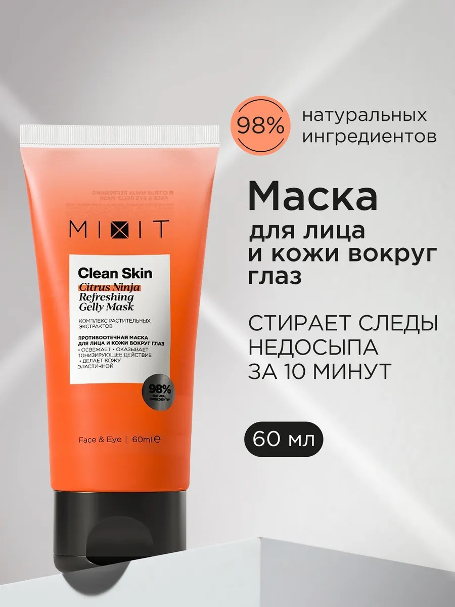 МИКСИТ Противоотечная утренняя маска для лица, кожи вокруг глаз и век в тюбике Clean Skin Citrus Ninja Refreshing Face & Eye Gelly Mask – это профессиональный уход против отеков и морщин. Маска освежает цвет лица, оказывает тонизирующее действие, увлажняет, восстанавливает и питает кожу. Маска для лица MIXIT, питательная и успокаивающая, жидкая и освежающая, создана для сияния и красоты кожи, придаёт свежий и отдохнувший вид.