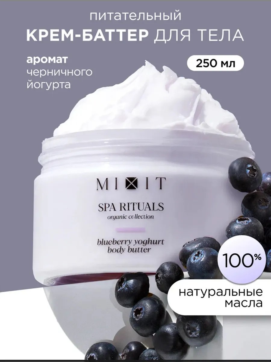МИКСИТ Увлажняющий крем-баттер для тела с ароматом черничного йогурта – это истинное наслаждение, которое превратит обыденный уход за кожей в настоящий спа ритуал. Косметика на основе масел мгновенно питает кожу, делает ее бархатистой, мягкой и эластичной. Это идеальное средство для девушек, желающих порадовать себя или подарить другим. Такой крем станет замечательным выбором в качестве подарочного набора на 14 февраля или 8 марта. Крем прекрасно впитывается, не оставляя жирного блеска. Подходит для использования на всех частях тела: руках, ногах и теле. Питательный крем помогает смягчить проблемные участки, устраняя сухость и раздражения даже на очень сухой коже. От растяжек и целлюлита. Профессиональный баттер обладает антивозрастными свойствами. Женский парфюмированный крем баттер для тела с маслом ши также может быть использован в массажных процедурах. А аромат свежей черники, приправленной нежностью сливок - истинное удовольствие для гурманов. Отличное дополнение к подарку подруге, любимой женщине, маме, дочке или коллеге, воспитателю или бабушке. Натуральные ингредиенты делают этот продукт особенно ценным в уходе за кожей. Способствует профилактике от растяжек для беременных. Такой баттер подойдет как подросткам, так и женщинам старшего возраста, так как обладает омолаживающим свойствам. Используйте баттер после душа или спа-процедур для максимального эффекта увлажнения и восстановления кожи. Каждый раз, когда вы наносите женский крем баттер для тела с кокосовым маслом, вы словно погружаетесь в мир сочной, спелой ягоды — парфюмированный аромат наполняет пространство, пробуждая воспоминания о теплых летних днях и радостных моментах. Насладитесь мгновениями уединения и заботы о себе. Уделите время уходу за собой с такими средствами; это не просто забота о внешности, а возможность побаловать любимых людей качественной натуральной косметикой. Этот продукт займет достойное место среди других уходовых средств в вашем арсенале красоты.
