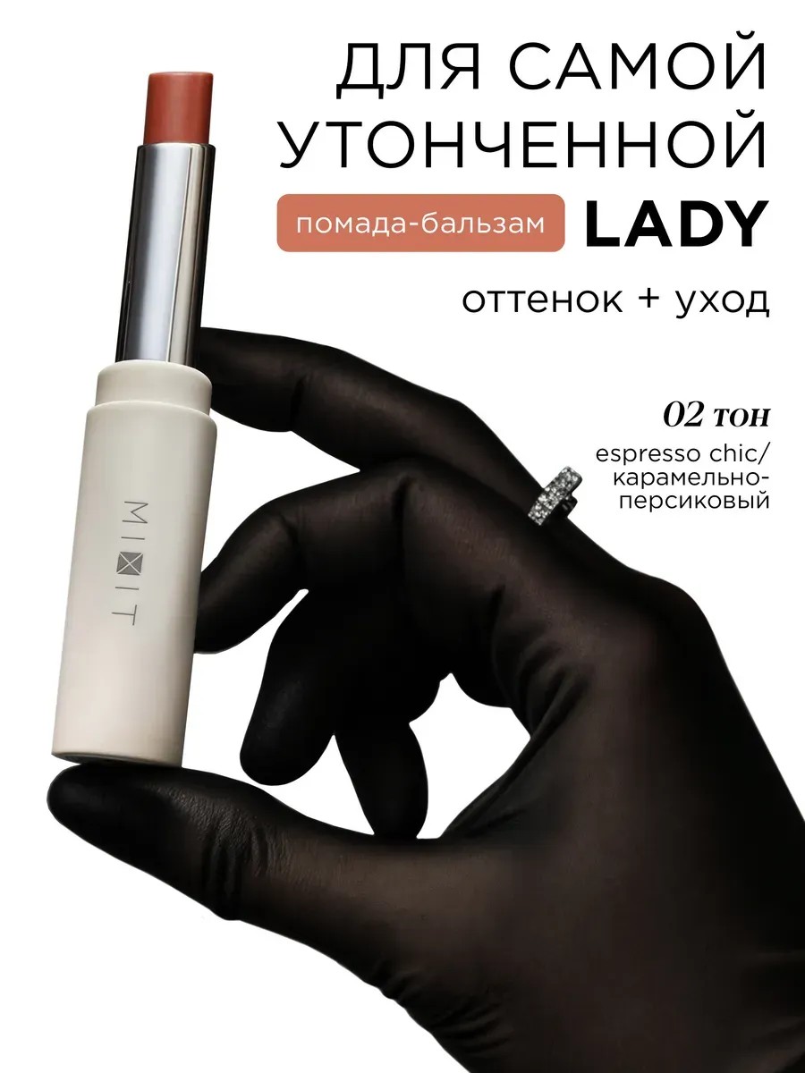 MIXIT Moisturizing Make Up Lipstick Balm, shade 02, hydrates and nourishes skin, eliminating flaking, providing rich color and a perfect finish. This satin, shiny nude lipstick with a matte finish enhances the natural beauty of lips and allows for a variety of makeup looks depending on your mood and occasion. Its melting, creamy, long-lasting texture applies easily and evenly without creasing.
