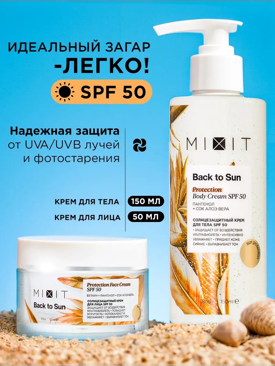 МИКСИТ Выгодный набор Back to Sun – эффективный комплексный дневной уход за кожей на лето! Он обеспечивает активную защиту от солнца, снижает риск возникновения меланомы и делает загар более ровным и стойким. Натуральный солнцезащитный крем для тела, рук и ног с spf 50 Protection Body moisturizing Cream и легкий увлажняющий крем для лица, зоны шеи и декольте с спф 50 Protection Face Cream. Смягчающий парфюмированный крем защищает от воздействия солнечных лучей, увлажняет и предупреждает появление пигментных пятен, от сухости и зуда.