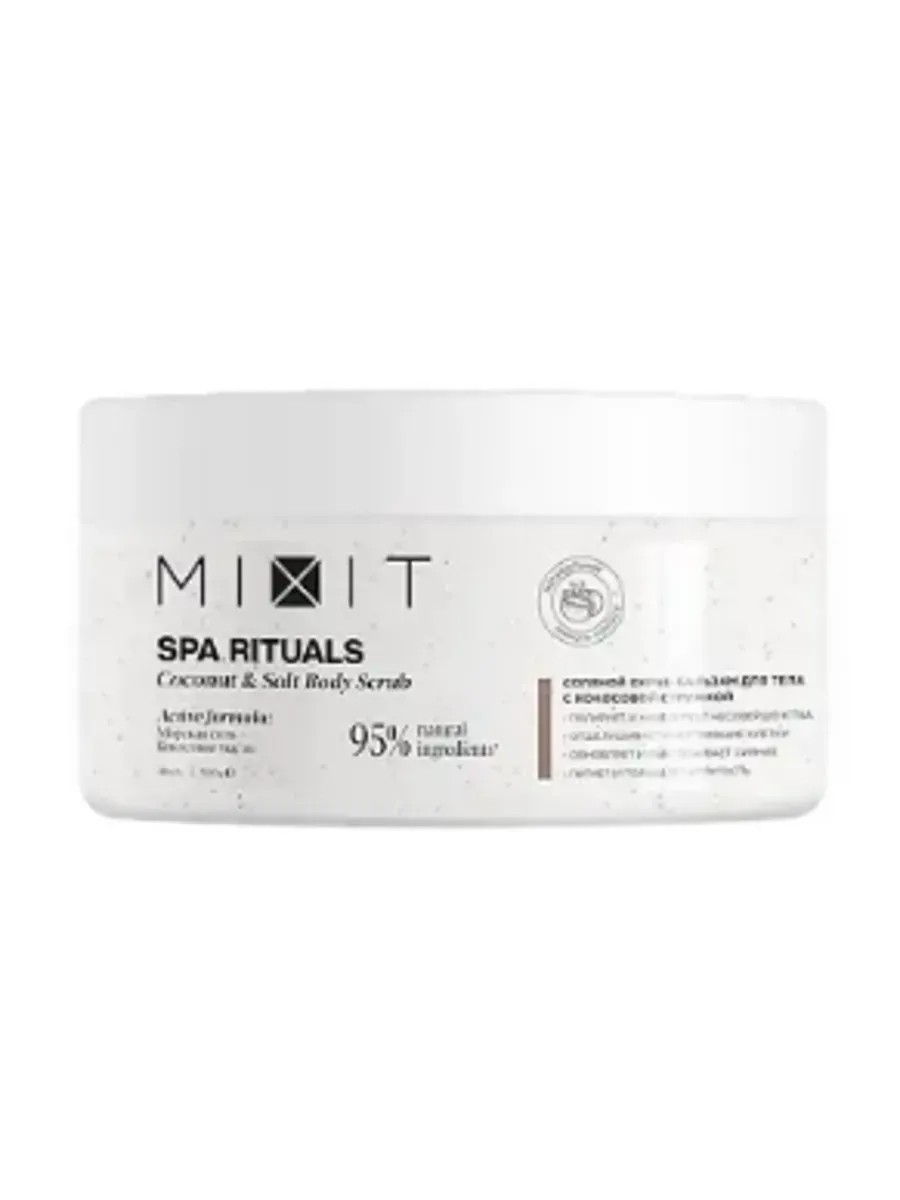 Mixit, Spa Rituals Salt Body Scrub and Balm with Coconut, 300 g, 1 pc. This salt body scrub and balm with coconut will help you discover a ritual of pleasure and renewal in your body care. This product gently and effectively polishes, leaving your skin incredibly soft and smooth. Sea salt and coconut smooth the skin, removing dead skin cells, allowing the skin to renew and regain its radiance. A combination of oils intensely nourishes and improves elasticity. The delicious and inviting aroma of coconut adds a special charm to the product, relaxing and restoring your emotional state.