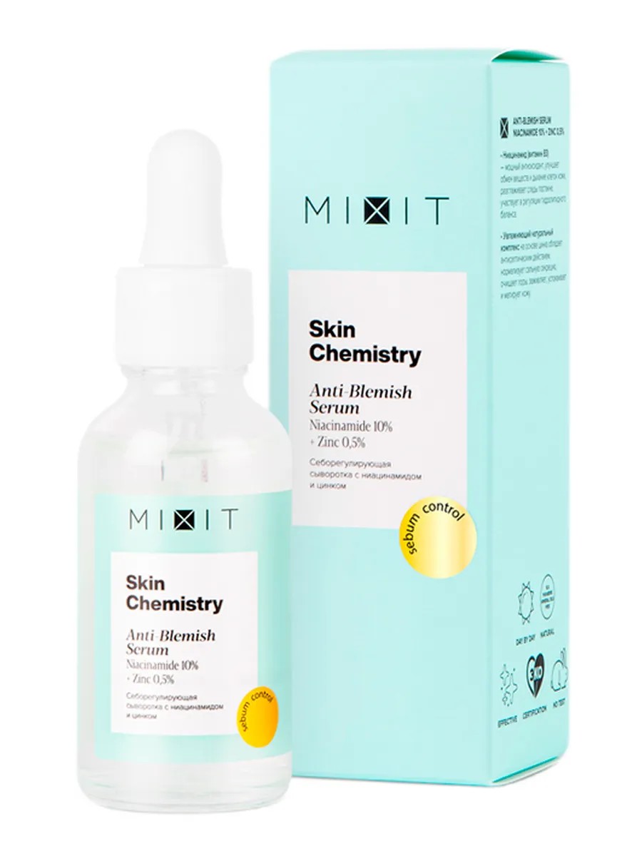 Sebum-regulating serum with niacinamide and zinc normalizes sebum production, tightens pores, gradually eliminates inflammation, smoothes and reduces traces of post-acne, has an antiseptic effect, mattifies the skin.