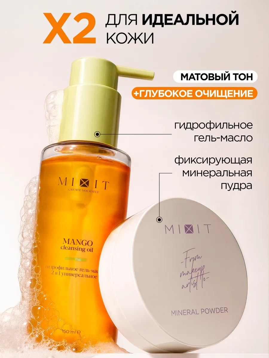 Набор MIXIT — это ваш секрет безупречной кожи с эффектом фотошопа! В него входят две незаменимые beauty-помощницы: рассыпчатая минеральная пудра и гидрофильное масло. Рассыпчатая, белая, бесцветная минеральная пудра деликатно ложится на кожу, словно шелковая вуаль, скрывая все несовершенства и придавая ей сияние. Ее матирующая формула подарит вам ощущение комфорта в течение всего дня, контролируя блеск даже на жирной коже. Фиксирующая пудра делает кожу матовой, убирая жирный блеск, гладкой и бархатистой, маскирует дефекты и неровности. А благодаря стойкой формуле пудры рассыпчатой прозрачной, макияж будет надежно зафиксирован в течение всего дня. Используйте пуховку или спонж для получения натурального легкого покрытия, выравнивания тона и эффекта фотошопа. Лёгкая, натуральная тональная пудра не подчёркивает поры и не провоцирует прыщи- пудра некомедогенная. Светоотражающая пудра рассыпчатая обладает универсальным полупрозрачным оттенком и создает на коже легкую невесомую вуаль, поэтому подходит для любых оттенков кожи, не осветляет кожу, смотрится естественно и незаметно, подстраивается под цвет лица и выравнивает тон. Минеральная косметика MIXIT подходит как для пудры для бейкинга, так и для матирующей компактной пудры для лица.