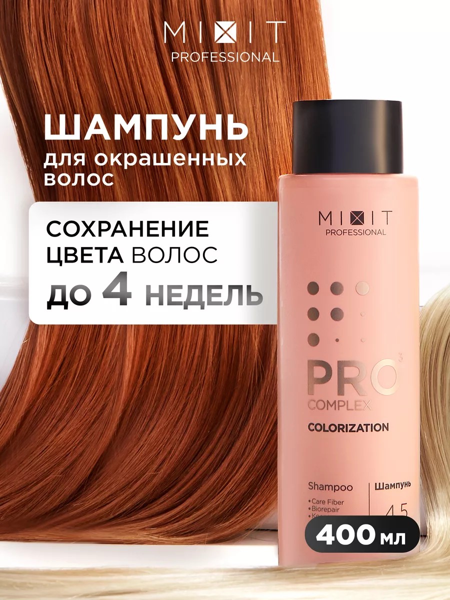 МИКСИТ Парфюмированный увлажняющий шампунь для окрашенных волос с коллагеном Professional Colorization hair Shampoo, 400 мл – это профессиональный салонный и домашний уход на основе системы биоэфирной доставки Care Fiber и комплекса, который обеспечивает мягкое очищение без пересаживания, защищает цвет от вымывания и тусклости после окрашивания. Он оказывает антистатик эффект, возвращает здоровый блеск и прочность, укрепляет и восстанавливает структуру мелированных, осветленных, тонких, пористых, ослабленных, ломких, жестких, непослушных и пушистых волос блонда. Восстанавливающий и очищающий женский шампунь идеален для укрепления волос у блондинок и брюнеток. Он бережно очищает и поддерживает естественный уровень pH кожи головы.