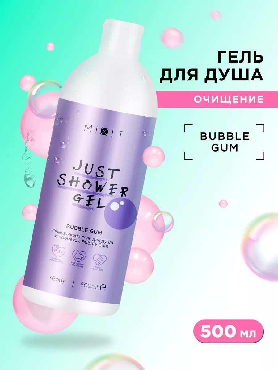 МИКСИТ Подарочный очищающий гель для ухода за кожей тела Just Shower Gel Bubble Gum в упаковке 500 мл. Уходовое средство направлено на очищение, интенсивное увлажнение и повышение упругости. Ароматизированный гель для душа с запахом бабл гам оказывает антибактериальное действие и сохраняет красоту кожи. Энергетический арома гель создает густую пенку, которая глубоко очищает и интенсивно увлажняет кожу во время купания.
