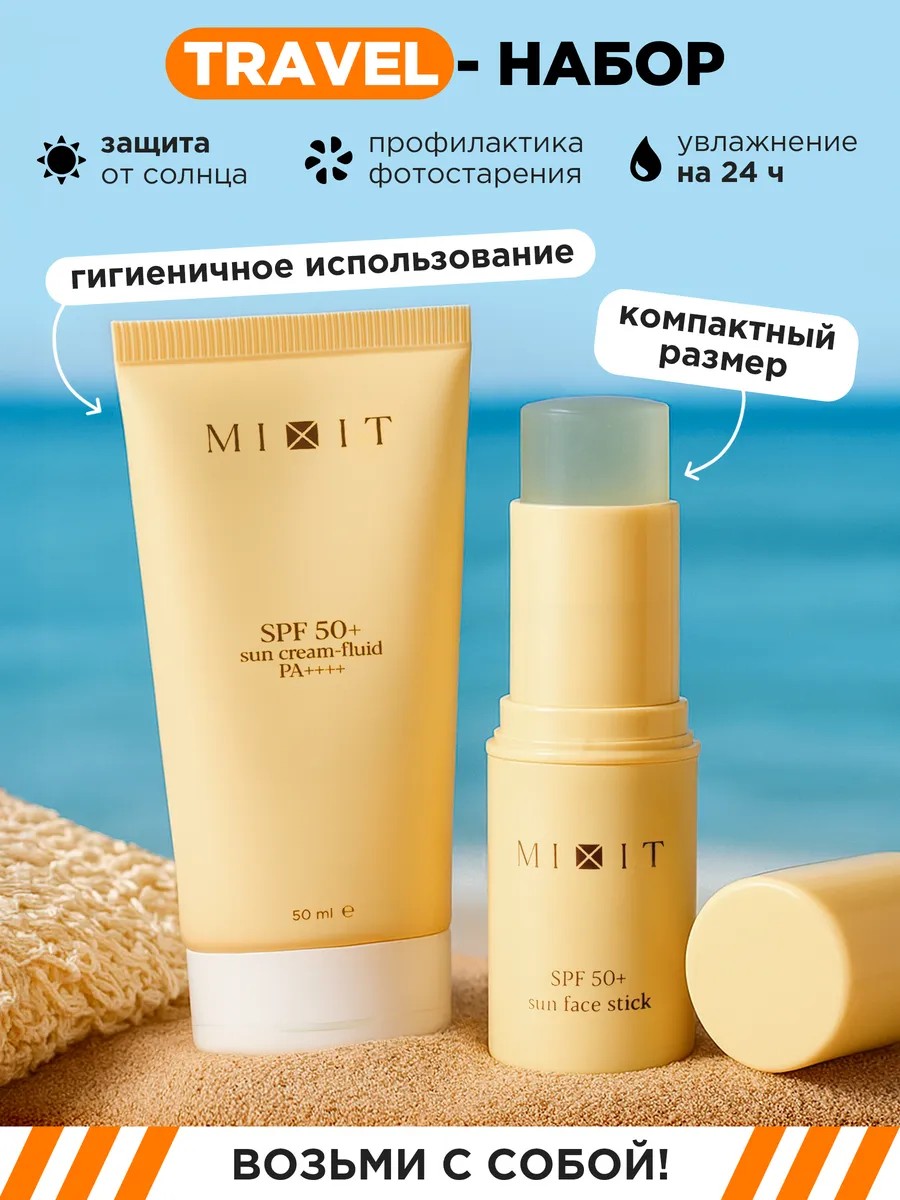 Компактный тревел набор MIXIT с легким солнцезащитным кремом и спф стиком с высокой степенью защиты от ультрафиолетовых лучей. Средства обеспечивают надежную уф-защиту кожи лица, шеи, декольте и тела.
