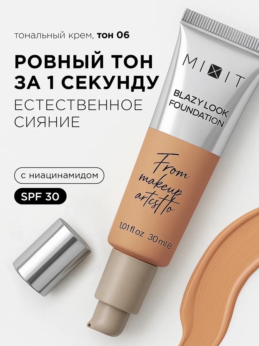 МИКСИТ Тональный крем Make Up Foundation Blazy Look, тон 06 – идеальное средство с SPF 30 для макияжа лица! Эта жидкая тональная основа подойдет как для девушек - подростков, так и для взрослых женщин. Тональный крем для лица плотный с выравнивающим кожу эффектом – универсальный вариант для всех типов женской кожи: сухой, жирной, комбинированной, возрастной и даже проблемной или чувствительной. В линейке представлены оттенки для любого оттенка кожи: от белого цвета слоновой кости, натурального тона, бежевого до цвета загара и смуглого. Тоналка плотная с удобным дозатором отлично подходит для смуглой и загорелой кожи. Несмотря на легкую текстуру, этот легкий тональник - флюид создает стойкое покрытие и отлично перекрывает покраснения и пигментные пятна. Тонирующий крем для лица подходит для создания безупречного макияжа, он легко наносится и держится на коже в течение всего дня. Тональный крем подстраивающийся под тон кожи и создающий эффект фотошоп. Тональный крем с уф защитой от UV-излучения летом. С помощью этой тональной основы с спф вы без труда получите ровный тон и финиш с эффектом сияния. Тональный крем увлажняющий отлично наносится на проблемные зоны, равномерно распределяется и не перегружает мейкап. Подходит также и для тела.
