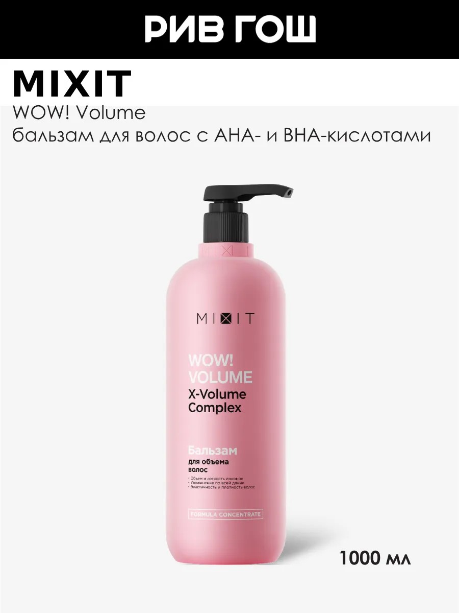 Бальзам-ополаскиватель для придания объема и блеска. Визуально уплотняет волосы и быстро впитывается. Интенсивно увлажняет и делает их мягкими по всей длине. Не утяжеляет волосы. Питает и восстанавливает поврежденные, сухие, пористые окрашенные волосы. • Прикорневой суперобъем• Мягкие волосы по всей длине• Интенсивное увлажнение локонов• Визуально плотные и блестящие волосы. Активные компоненты:• АНА-кислоты - отшелушивают и очищают волосы у корней• Салициловая кислота (BHA) - уменьшает жирность кожи головы, продлевает чувство чистоты и свежести волос, налаживает себорегуляцию• Экстракт орхидеи - предотвращает потерю влаги, контролирует непослушные волосы, придает объем• Масло макадамии - уплотняет и укрепляет волосы, делает локоны блестящими, уменьшает сечение кончиков. Бальзам-ополаскиватель для волос MIXIT WOW!Volume AHA & BHA для придания объема, 1000 мл. У нас Вы всегда сможете подобрать женскую и мужскую парфюмерию, декоративную косметику, а так же уходовые средства для волос, тела и лица. РИВ ГОШ вдохновляет дарить подарки каждый день.Приобретая бальзам кондиционер для волос увлажняющий, вы получаете не просто косметическое средство, а продукт, способствующий здоровью и красоте ваших волос. Наш питательный бальзам обогащен уникальными ингредиентами, которые питают и увлажняют волосы, делая их мягкими, шелковистыми и блестящими. Бальзам восстанавливающий идеально подойдет для разных типов волос. Богатая формула бальзама способствует укреплению волос, делая их сильными и здоровыми от корней до кончиков.