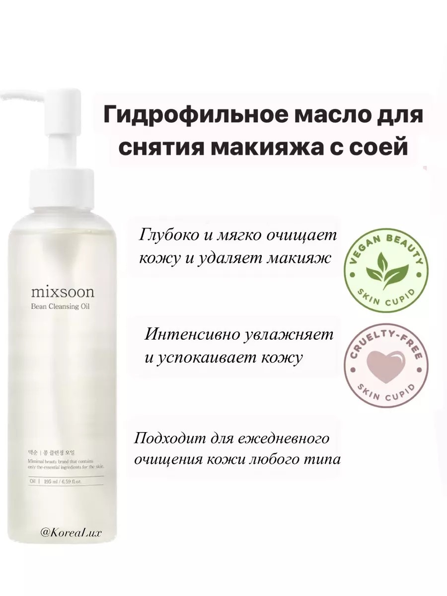 Mixsoon Bean Cleansing Oil 195ml. This hydrophilic oil cleanses the skin, removes excess sebum and all types of impurities, eliminates shine, and refreshes. This Korean hydrophilic cleansing oil dissolves makeup, including waterproof ones.