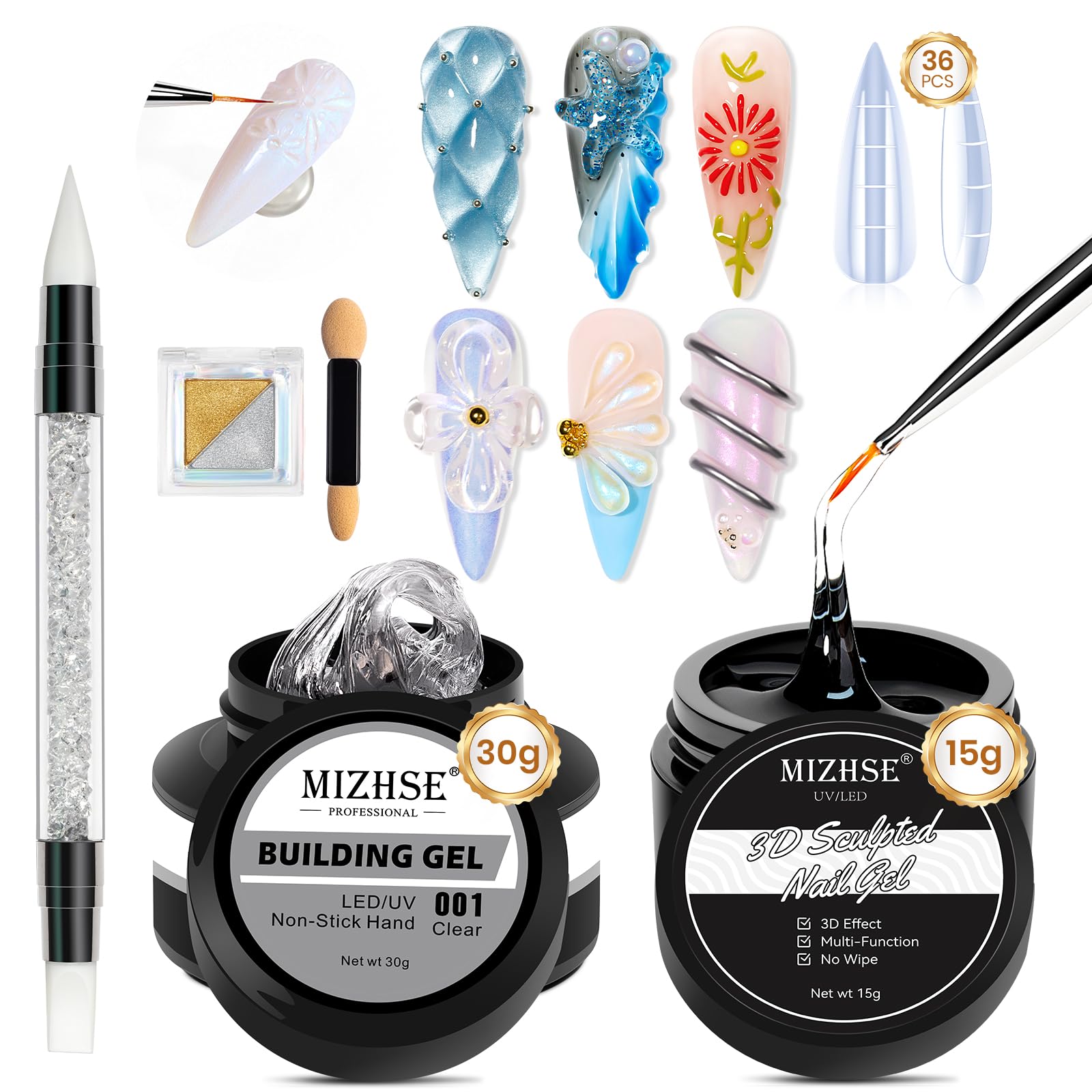 DURABLE - All our products are made from 9 non-toxic, low-odor, non-toxic ingredients, are cruelty-free, and environmentally friendly. Enjoy a pleasant and hassle-free manicure. Chrome Nail Powder for 3D Nail Art: This series of mirror-effect glitter powder can make your nail enhancements more interesting and charming. It is made of 100 pure resin powder and has a smooth, granular texture. 3D Sculpting Gel: 15g of clear 3D sculpting gel allows even beginners to effortlessly create desired shapes. The 3D sculpting gel can be used to create themed designs. Strong Nail Glue Gel: 30g of clear strong nail glue. You can use this gel to create a variety of three-dimensional shapes, and you can also design nail styles with other colored gels. MIZHSE All-in-One Kit: Ideal for use with other nail art products such as natural nails, nail tips, false nails, acrylic nails, etc.MIZHSE Transparent Gel De Construction Solide Pour Sculpture 3D, Kit Tout-En-Un Pour Nail Art En Gel 3D, Extension d'Ongle, Gels De Colle Strass, Sculpture d'Ongles, Gels De Colle Solide Pour OnglesDURABLE - Tous nos produits sont fabriqués à partir de 9 ingrédients non toxiques, à faible odeur, non toxiques, sans tests sur les animaux et respectueux de l'environnement. Assurez-vous une manucure agréable et sans tracas. Poudre à Ongles Chromée Pour Nail Art 3D : la série de paillettes en poudre effet miroir peut rendre votre amélioration des ongles plus intéressante et charmante. Il est composé de poudre de résine 100 pure et a une texture lisse et granuleuse. Gel de sculpture 3D : 15 g de gel de sculpture 3D transparent permet même aux débutants de créer sans effort les formes souhaitées. Le gel de sculpture 3D peut être utilisé pour créer des motifs thématiques. Gel De Colle à Ongles Solide : 30 g de colle à ongles solide transparente. Vous pouvez utiliser ce gel pour créer une variété de formes tridimensionnelles, et vous pouvez également concevoir des styles d'ongles avec d'autres gels de couleur. Kit tout-en-un MIZHSE: Idéal pour une utilisation avec d'autres produits de nail art tels que les ongles naturels, les pointes d'ongles, les faux ongles, les faux ongles, les ongles en acrylique, etc.