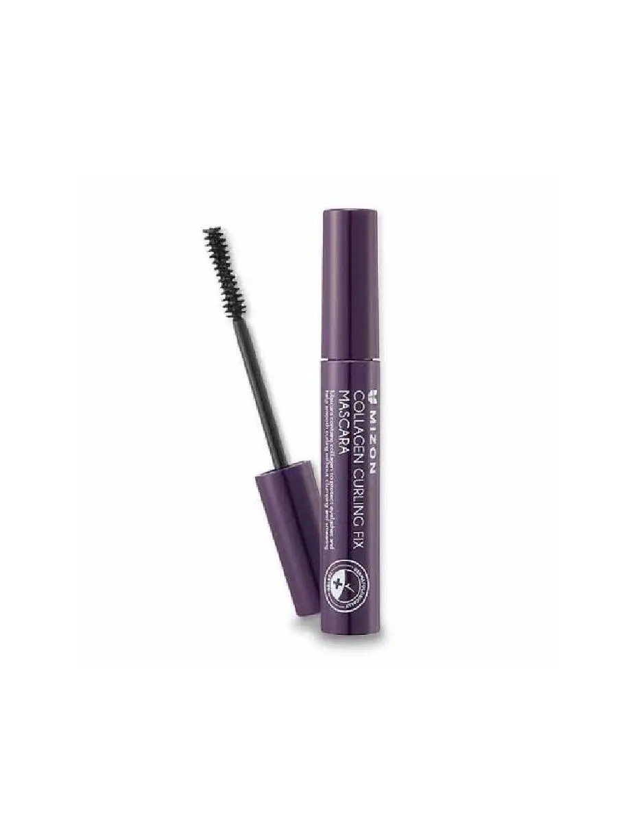 Mizon Collagen Curling Fix Mascara, a waterproof mascara with collagen, curls and adds volume. It applies evenly and doesn't clump. It lasts all day without flaking. It nourishes, strengthens, and moisturizes lashes thanks to hydrolyzed collagen. Key features: It's waterproof, adds volume, and curls lashes. It's easy to apply without clumping. It lasts all day without flaking. It protects from harmful external factors, strengthening lashes.