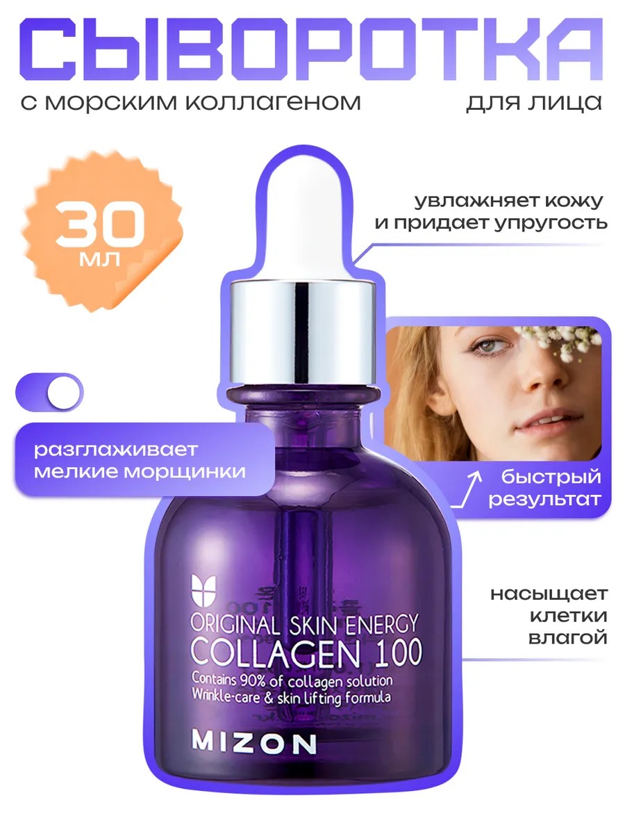 MIZON Collagen 100 — увлажняющая сыворотка для лица с высококачественным коллагеном, восстанавливающим упругость и эластичность кожи. Подходит для всех типов кожи и помогает в борьбе с признаками старения.