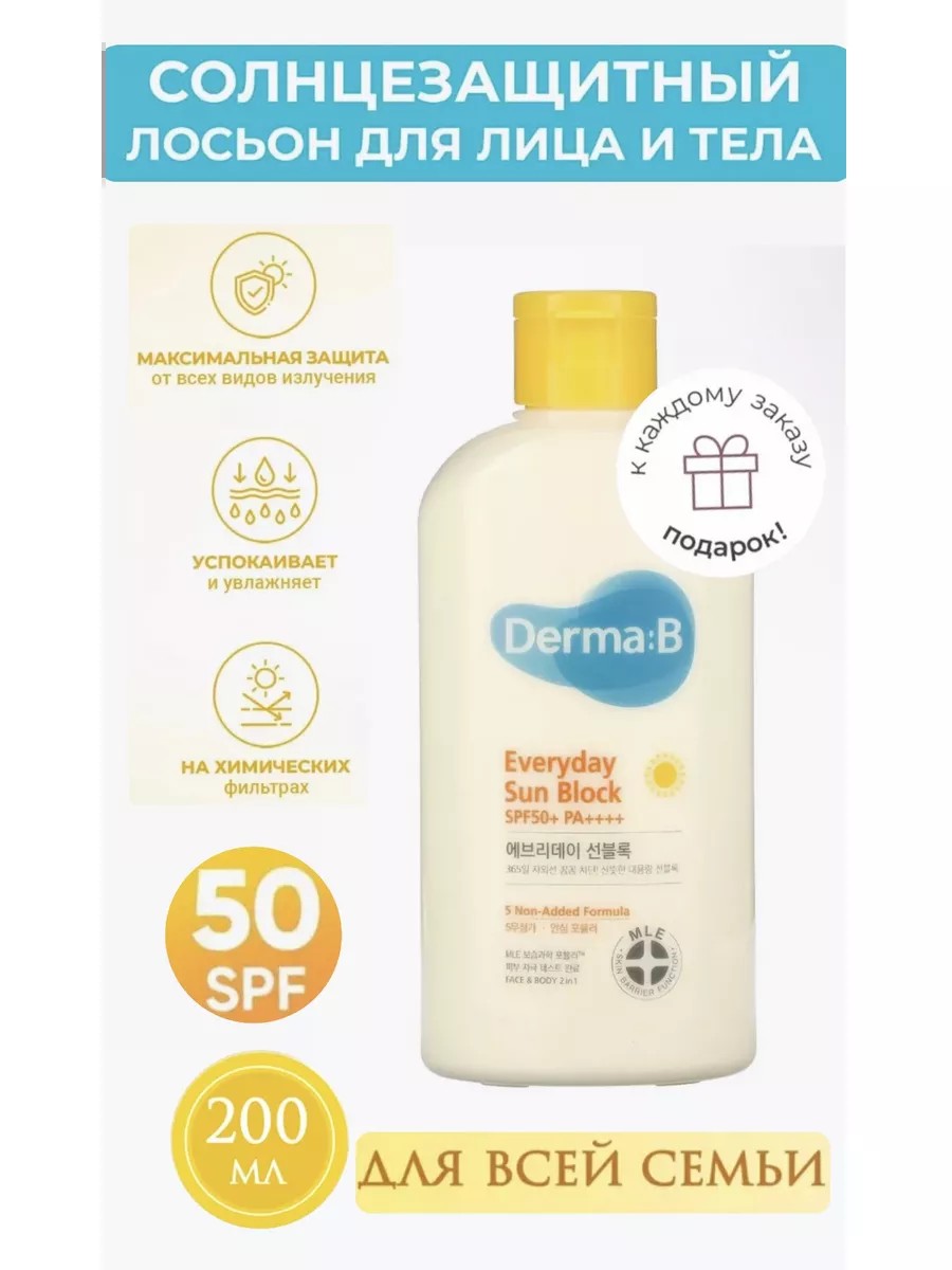 Солнцезащитный лосьон Derma:B Sun Block SPF50+ PA++++ увлажняет, успокаивает и смягчает, снимает раздражение и покраснение, прекрасно подходит для всей семьи.
