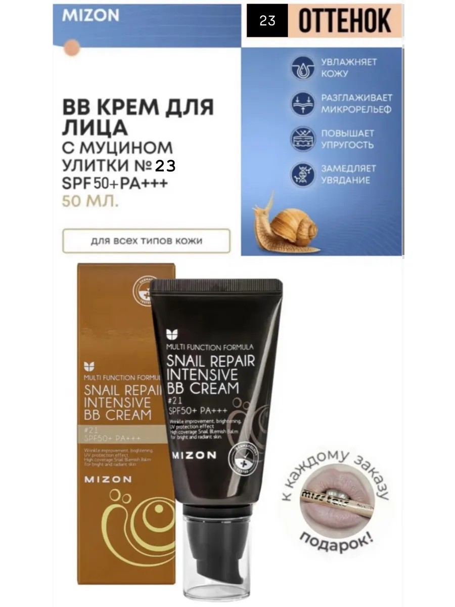 23 ТОН Mizon Snail Repair Intensive BB Cream SPF50+ РА+++ Увлажняющий ВВ-крем с муцином улитки прекрасно скрывает несовершенства кожи, улучшает тон и возвращает лицу естественное сияние. Также продукт обладает уходовыми функциями — увлажняет и способствует удержанию влаги в клетках кожи, ускоряет процессы регенерации и дает омолаживающее действие. Легкая текстура крема не утяжеляет и не создает эффект маски, удобно распределяется и подстраивается под тон кожи. Содержит 35% улиточного муцина. Интенсивно увлажняет, устраняет сухость и шелушения, создает на поверхности кожи особое защитное покрытие, которое препятствует испарению влаги из кожи. Активизирует процессы регенерации и обновления клеток эпидермиса. Идеально подходит для устранения несовершенств, тусклости и серого тона кожи. Безопасная формула, подходящая для чувствительной кожи. Продукт не вызывает зуда, раздражений и покраснений. Он не содержит парабенов и искусственных ароматизаторов. Легкая текстура с сияющим финишем. Преимущества: Способствует повышению упругости кожи, обладает легким омолаживающим действием и замедляет процессы старения; Уникальная система Moisture Capturing System - Повышает абсорбирующую способность кожи, – нормализует водно-жировой баланс эпидермиса, – успокаивает и ускоряет процессы заживления.