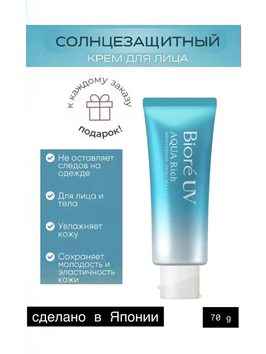 Солнцезащитный СПФ 50 крем флюид Biore UV Aqua Rich первая в мире формула защиты и равномерного покрытия кожи на микро уровне. Невероятная ультра-легкая текстура, абсолютно невесомая на коже. Содержит гиалуроновую кислоту, экстракт маточного молочка, и увлажняющие компоненты. Подходит для ежедневного ухода круглый год, может использоваться как база под макияж. Флюид для лица длительного действия с высоким уровнем защиты лица и тела SPF+ PA++++. Водостойкая формула, устойчива к воде и поту. Эффективно защищает кожу от UVB лучей, которые являются причиной появления веснушек и пигментных пятен, а также от UVA лучей которые вызывают ослабление кожных покровов и приводят к появлению морщин. Легкая водная текстура моментально впитывается и не оставляет липких ощущений. Оригинал! Первая в мире формула защиты и равномерного покрытия кожи на микро-уровне! Невероятная ультра-легкая текстура, абсолютно невесомая на коже. Содержит гиалуроновую кислоту, экстракт маточного молочка, и увлажняющие компоненты. Подходит для ежедневного ухода круглый год, может использоваться как база под макияж. Флюид для лица длительного действия с высоким уровнем защиты лица и тела SPF+ PA++++. Водостойкая формула, устойчива к воде и поту. Эффективно защищает кожу от UVB лучей, которые являются причиной появления веснушек и пигментных пятен, а также от UVA лучей которые вызывают ослабление кожных покровов и приводят к появлению морщин. Легкая водная текстура моментально впитывается и не оставляет липких ощущений. Нежирный, с легким ароматом ландышей. Может применяться как основа под макияж. Легко распределяется и моментально впитывается без белых следов на коже. Без красителей.