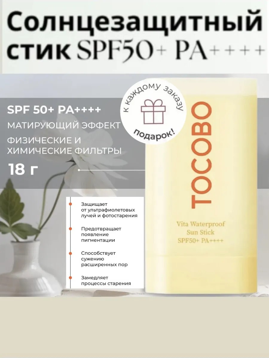 TOCOBO Vita Waterproof Sun Stick SPF50+ PA+, based on next-generation physical and stable chemical filters, helps protect delicate facial skin from the harmful effects of UV radiation and photoaging. It also offers absolute protection for vulnerable areas of the body, including the nose, eye area, cheekbones, forehead, shoulders, tattoos, and moles, preventing burns and redness after prolonged sun exposure. This sunscreen stick actively protects the skin from the harmful effects of UV radiation, hyperpigmentation, photoaging, and burns. Its waterproof formula does not dissolve or smear under the influence of sebum or water, maintaining its effect for a long time. It leaves a comfortable matte finish on the skin and prevents excess sebum production, leaving no white residue or oiliness. Vitamin E (tocopherol) is a powerful antioxidant that fights free radicals and slows skin aging. Centella asiatica and its active ingredients soothe, strengthen, and restore the skin, reducing inflammation. Sea buckthorn extract nourishes the skin with vitamins and fatty acids, strengthening and brightening. Turmeric extract has anti-inflammatory and antioxidant properties, improving overall skin tone. Chamomile and aloe vera extracts relieve redness, soothe sensitive skin, and maintain hydration. All ingredients are EWG-certified and safe for use. Certified Vegan. This product has been dermatologically tested and deemed safe for sensitive skin. Its compact format is convenient for travel. Suitable for all skin types. Directions: After all steps of your daily skincare routine and before makeup, apply the stick to your face, neck, and other exposed areas of skin. If exposed to direct sunlight (for example, at the beach), renew the protective layer every 2-3 hours.