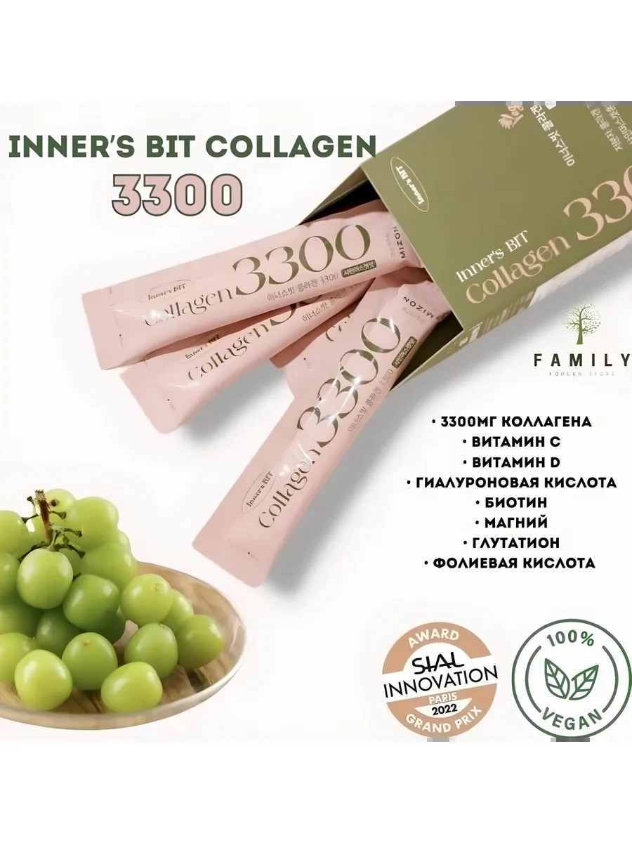 Коллаген-желе от компании Mizon, Inner's Bit Collagen 3300 - представляет собой 100% веганский коллаген-желе в удобном формате стиков. Продукт завоевал популярность в Корее и за ее пределами благодаря своей эффективности, и приятному вкусу винограда, известного в азии как "Королева муската" либо "Шайн-Мускат". Основными преимуществами являются дополнительные питательные вещества, высокая усваиваемость, приятный вкус и удобная упаковка.