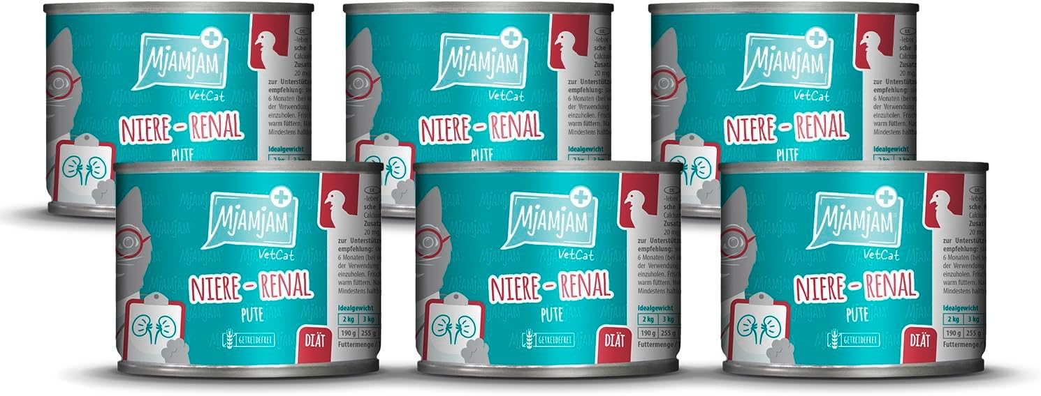 Adult cats with kidney problems need not only lots of love, but also a diet that provides sufficient support. For those who don't want to give up incomparable taste, it's time to listen. Dr. VetCat recommends: MjAMjAM VetCat Renal! This meal can not only support your darling in case of kidney problems, but at the same time offers your cat the usual MjAMjAM taste experience. INGREDIENTS Turkey meat, heart and liver 28 , dehydrated carrots 2 , minerals, linseed oil, seaweed meal. Animal protein source(s): Turkey. DIRECTIONS FOR USE Initially up to 6 months (2-4 weeks in case of temporary kidney failure). It is recommended to seek veterinary advice before use or before extending the feeding period. Fresh drinking water should always be freely available. Please feed at room temperature. After opening, keep refrigerated for up to 24 hours. ? REGIONAL: Made with ingredients from regional agriculture. COMPOSITION: Formula adapted to common cat illnesses, in accordance with the needs of the species, close to nature and the hive. MjAMjAM: Complete food with an extra high percentage of meat, essential vitamins and minerals, grain-free. BY VETERINARIANS: Developed and tested. SPECIAL FOOD: Wet food for cats, in case of health problems. Les chats adultes souffrant de problèmes rénaux ont besoin non seulement de beaucoup d'amour, mais aussi d'une alimentation qui les soutienne suffisamment. Pour ceux qui ne veulent pas renoncer à un goût incomparable, il est temps de tendre l'oreille. Dr. VetCat recommande : MjAMjAM VetCat Renal ! Ce repas peut non seulement soutenir ton chéri en cas de problèmes rénaux, mais il offre en même temps à ton chat l'expérience gustative habituelle de MjAMjAM INGRÉDIENTS Viande, cœur et foie de dinde 28 , carottes déshydratées 2 , substances minérales, huile de lin, farine d'algues marines. Source(s) de protéines animales : Dinde. MODE D'EMPLOI Initialement jusqu'à 6 mois (2 à 4 semaines en cas d'insuffisance rénale temporaire). Il est recommandé de demander l'avis d'un vétérinaire avant l'utilisation ou avant de prolonger la durée de l'alimentation. De l'eau potable fraîche devrait toujours être à libre disposition. Veuillez donner à manger à température ambiante. Après ouverture, conserver au réfrigérateur pendant 24 heures maximum. ? REGIONAL : composé d'ingrédients issus d'une agriculture régionale. COMPOSITION : Formule adaptée aux maladies courantes des chats, conforme aux besoins de l'espèce, proche de la nature et de la ruche. MjAMjAM : aliment complet avec un pourcentage de viande extra élevé, des vitamines et des minéraux essentiels, sans céréales. PAR DES VÉTÉRINAIRES : développé et testé. ALIMENTS SPÉCIAUX : aliments humides pour chats, en cas de problèmes de santé.