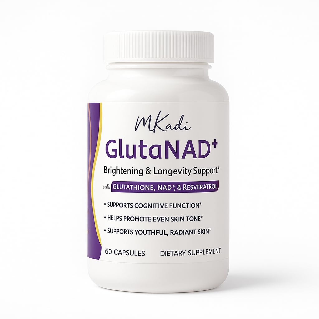 MKADI GlutaNAD is a daily vegan supplement designed to support radiant skin, cellular energy, and healthy aging from within. Each serving combines L-Glutathione, NAD , NAC, Resveratrol, and a targeted antioxidant complex to help defend against oxidative stress and promote a brighter, more even-looking complexion. MKADI L-Glutathione (300 mg) is known as the "master antioxidant" and helps reduce oxidative stress while supporting a more luminous, balanced skin tone. NAD (250 mg) is an essential coenzyme for cellular repair and energy production, helping maintain youthful vitality. N-Acetyl-L-Cysteine (NAC), Resveratrol, Vitamin E, Selenium, Green Tea, and Pine Bark Extract work together to nourish skin, support natural detox pathways, and protect cells from environmental damage. MKADI GlutaNAD is vegan, non-GMO, and free from gluten, soy, and dairy, and is made in a GMP-certified facility in the USA for quality you can trust. Suggested use: take 2 capsules daily with food or as directed by your healthcare provider. MKADI Disclaimer: These statements have not been evaluated by the Food and Drug Administration. This product is not intended to diagnose, treat, cure, or prevent any disease.Radiant skin support NAD Helps promote a brighter, more even-looking complexion and healthy skin glow from within. L-glutathione NAD blend – Features L-Glutathione, NAD , NAC, Resveratrol and key antioxidants to help combat oxidative stress. Cellular energy healthy aging – Supports natural cellular energy production and overall vitality for everyday wellness. Clean, vegan formula – Vegan, non-GMO, and free from gluten, soy and dairy crafted in a GMP-compliant facility in the USA. Easy daily routine – 60 vegan capsules (30-day supply) take 2 capsules daily with food or as directed by your healthcare provider.