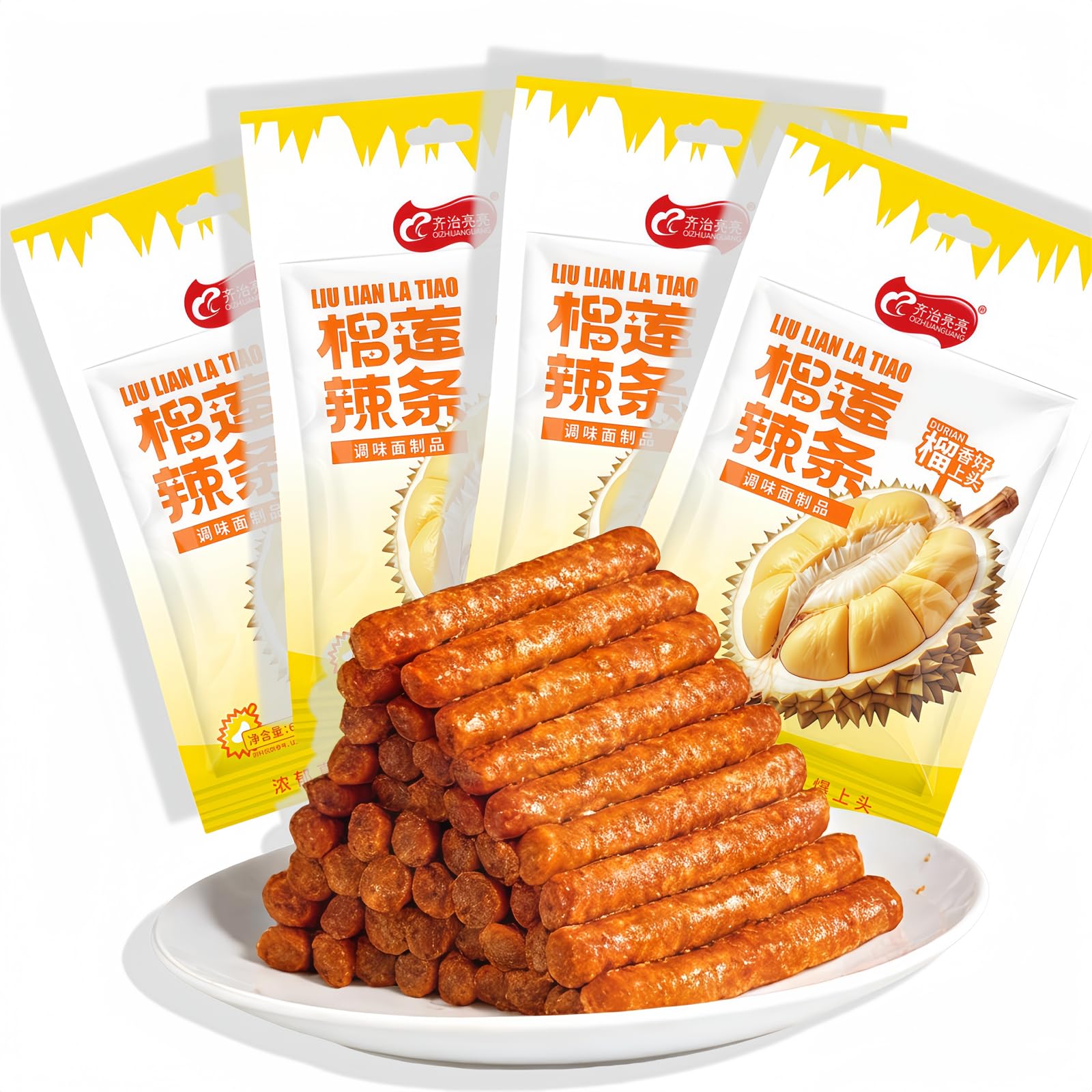 Product Name: Durian-latiao Product Type: Seasoned Noodles Ingredients: Wheat flour, drinking water, vegetable oil, salt, chili pepper, MSG, glycerin, spices, white sugar Packaging Specifications: 68g x 4 packs Production Date: See packaging (the date on the packaging is the production date) Shelf Life: 150 days Storage Method: Store at room temperature, avoid direct sunlight Consuming Method: Open the bag and eat. INGREDIENTS Wheat flour, drinking water, vegetable oil, salt, chili pepper, MSG, glycerin, spices, white sugar INSTRUCTIONS Ready to eat after opening the bag See moreMKSDDF - 68 g x 4 paquets de bandes épicées Latiao Durian - Bâtons épicés chinois - Snacks asiatiques - Snacks épicés - Ensemble cadeauDESCRIPTION DU PRODUIT DESCRIPTION DU PRODUIT Nom du produit : Durian-latiao Type de produit : Nouilles assaisonnées Ingrédients : farine de blé, eau potable, huile végétale, sel comestible, piment, MSG, glycérine, épices, sucre blanc. Spécifications de l'emballage : 68 g x 4 paquets. Date de production : voir l'emballage (la date sur l'emballage est la date de production) Durée de conservation : 150 jours. Méthode de stockage : stocker à température ambiante, éviter la lumière directe du soleil. Méthode d'alimentation : ouvrez le sac et mangez. INGRÉDIENTS Farine de blé, eau potable, huile végétale, sel comestible, piment, MSG, glycérine, épices, sucre blanc MODE D'EMPLOI Prêt à manger après ouverture du sac Voir plus
