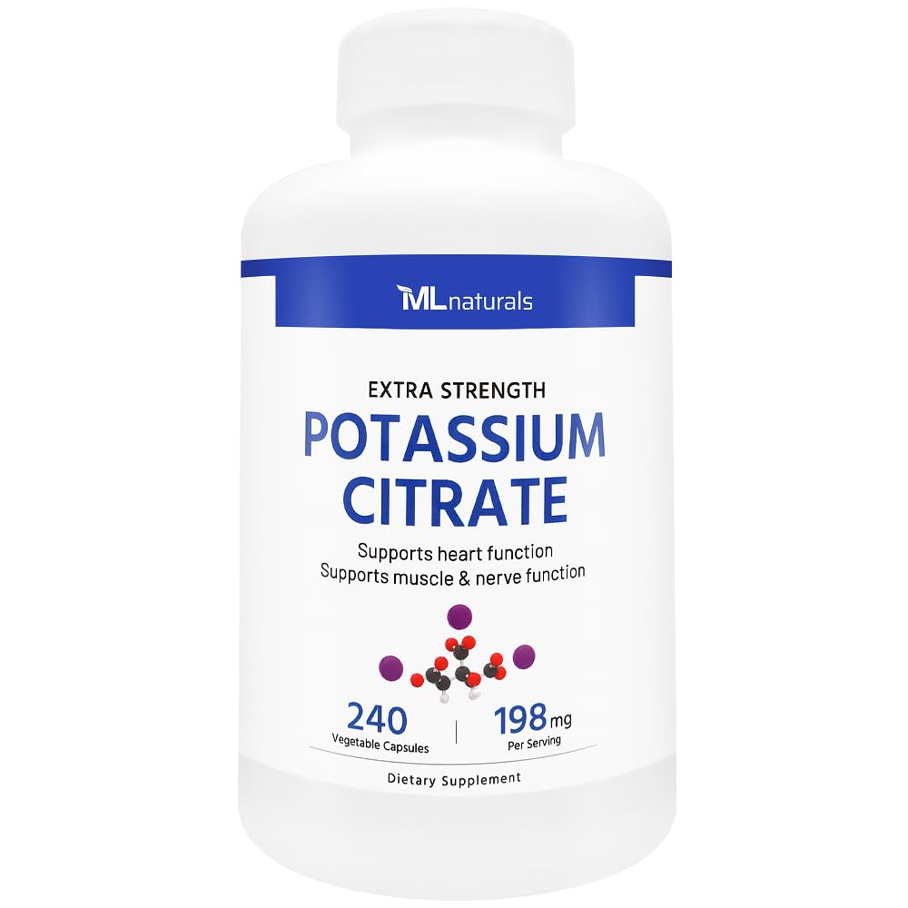 ML Naturals is a brand of My Life Inc. The facility's cGMP certification status can be verified on the official NSF website by searching "My Life Inc.". Manufactured in the USA in a facility certified by NSF for cGMP compliance. Non-GMO and Free of Gluten, Wheat, Yeast, Lactose, Artificial Flavor, Preservatives. Third-Party Lab Tested: Every batch is tested by an ISO-accredited third-party lab to ensure quality and safety. Vegetable capsules that digest and absorb quickly. Supports Muscle Nerve Function. High-Potency Potassium: Each serving provides 198 mg of elemental potassium from 620 mg of potassium citrate.