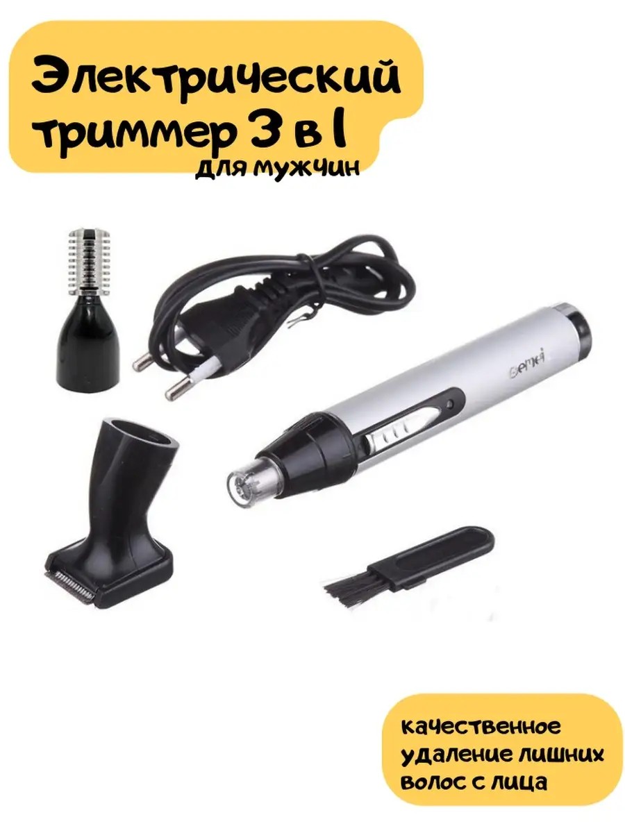 Триммер 3 в 1. Универсальный триммер предназначен для бережного удаления лишних волосков в носу и ушах, а также для бороды. Удобная головка обеспечивает быстрое, простое и комфортное подравнивание без неприятных ощущений. Использование такой машинки безопасно, ведь благодаря современным технологиям режущий элемент защищен специальной ультратонкой сеткой с закругленными кончиками, которые предотвращают раздражение кожи. Оптимальный угол наклона триммера позволяет легко подравнивать волоски в ушах и носу. Лезвия выполнены из прочной нержавеющей стали и прослужат вам долгое время. Триммер работает от встроенного аккумулятора и заряжается от сети. В составе набора 3 насадки - для окантовки, для бровей, для удаления волос в ушах и носу. Набор для удаления лишних волос / триммер для носа и ушей / триммер для волос в носу и ушах / машинка для стрижки в носу и ушах / триммер для ушей и носа мужской / триммер для бороды носа и ушей / безопасный универсальный триммер для удаления волос на лице.
